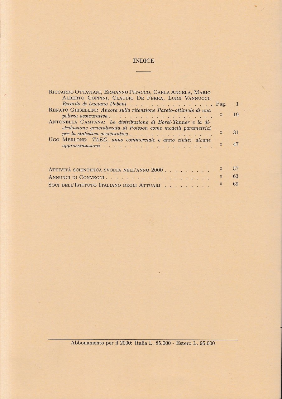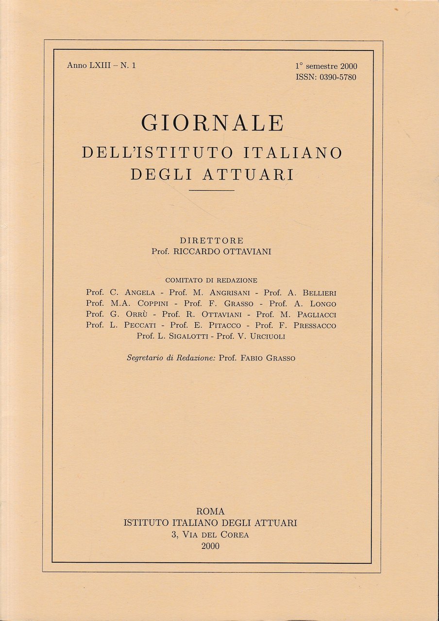 Giornale dell'Istituto Italiano degli Attuari. Anno LXIII - n.1, 1^ semestre 2000 (bilingue Italiano, Inglese) | Libri antichi e moderni | direttore Riccardo Ottaviani, ,direttore Riccardo Ottaviani