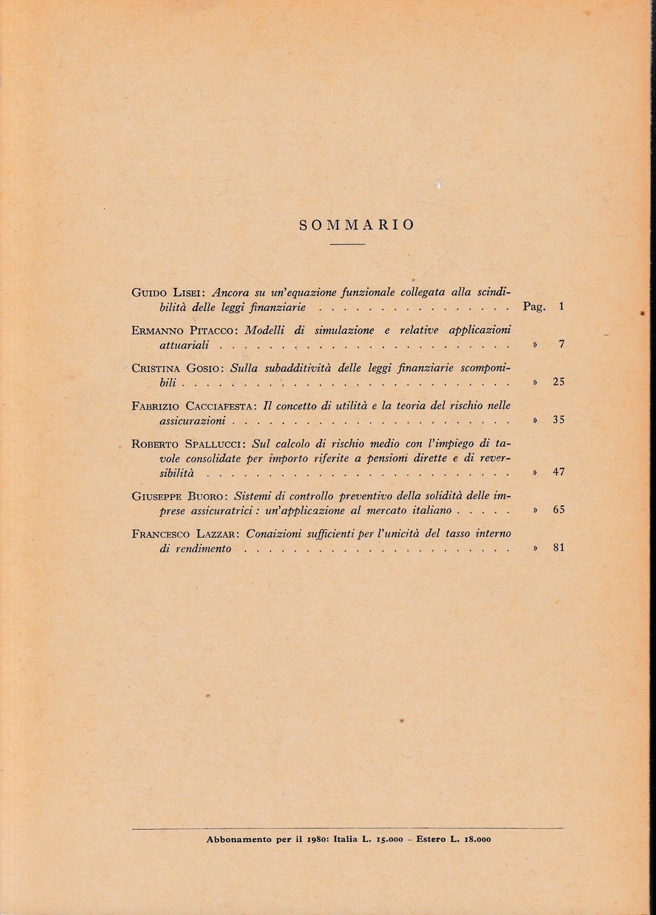 Giornale dell'Istituto Italiano degli Attuari. Anno XLIII - n. 2, 2^ semestre 1980 | Libri antichi e moderni | direttore Giuseppe Ottaviani, ,direttore Giuseppe Ottaviani