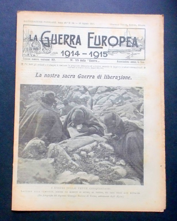 *** Giornale delle Famiglie - F. lli Treves - L'Illustrazione Popolare - La Guerra Europea del 1914-1915 - I nostri sulle vette conquistate: lettere alle famiglie, scritte nei momenti di riposo, al freddo, sui sassi delle alte montagne - N° 34 - 1915, pp. 16.Interessante pubblicazione, fonte ricchissima di informazioni per studiosi, appassionati e collezionisti