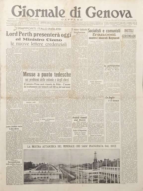 Giornale di Genova Caffaro N. 319 - Lord Perth presenterà al Ministro Ciano 1938
