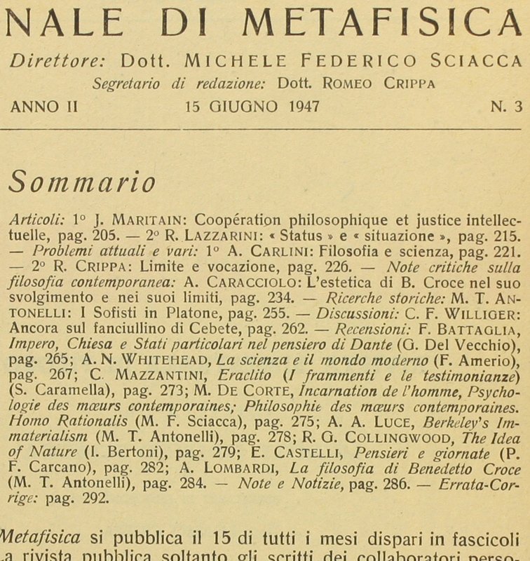 GIORNALE DI METAFISICA. Rivista Bimestrale di Filosofia. 1947 - N. 3. | Libri antichi e moderni | Sciacca Michele Federico (Direttore)