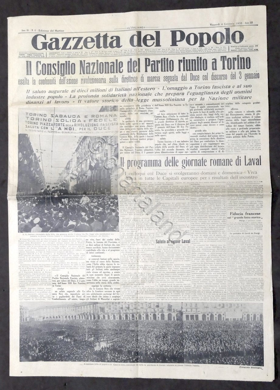 Giornale Gazzetta del Popolo N. 4 - Il Consiglio Nazionale del Partito riunito a Torino - 1935 Testo in lingua italiana, Pag. 8 con illustrazioni Condizioni buone