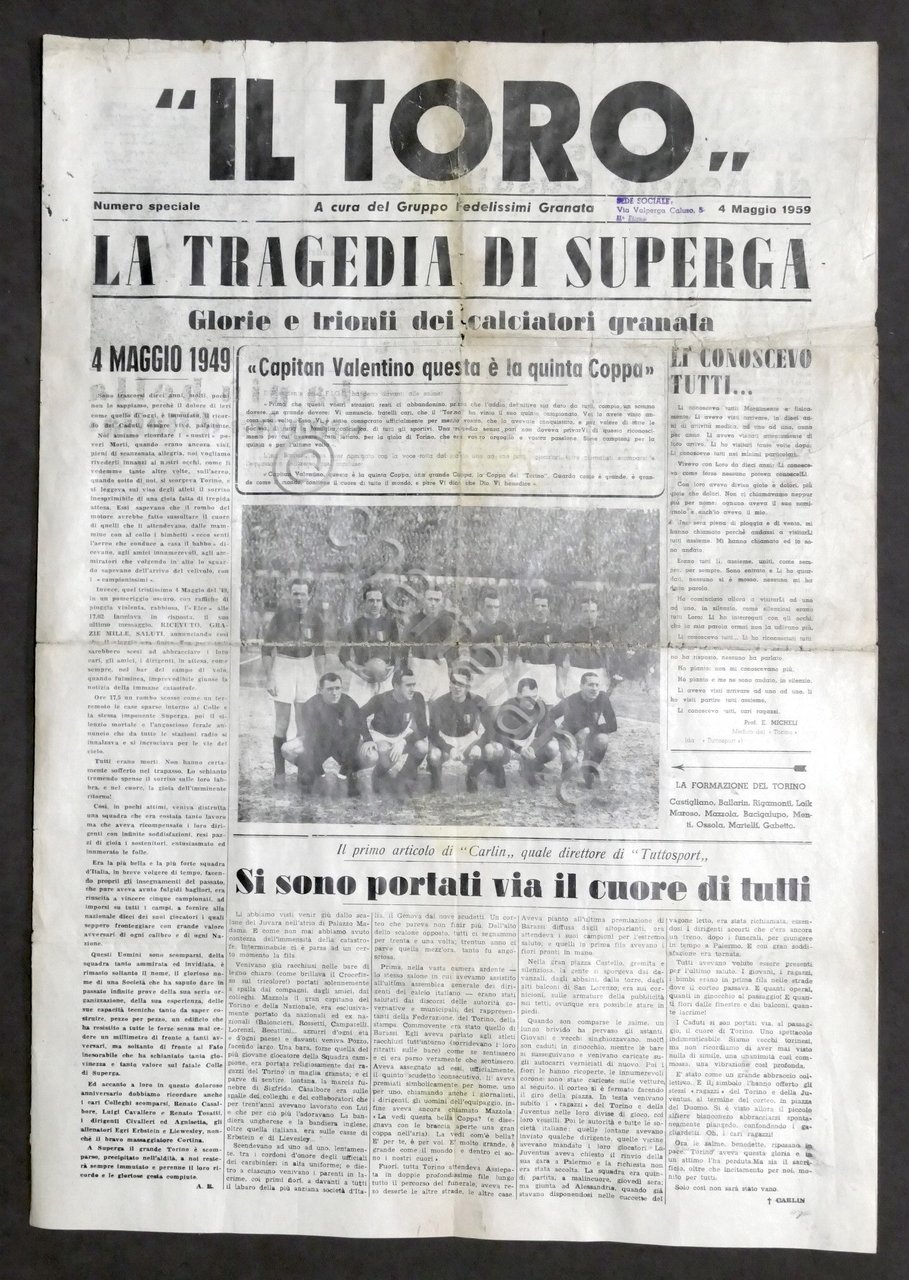 Giornale Il Toro - Numero speciale - A cura del gruppo fedelissimi Granata - 4 Maggio 1959 - La tragedia di Superga Dieci anni dall'incidente... Pag. 4 con alcune illustrazioni. Lingua italiana. Condizioni buone. Piccoli segni del tempo.