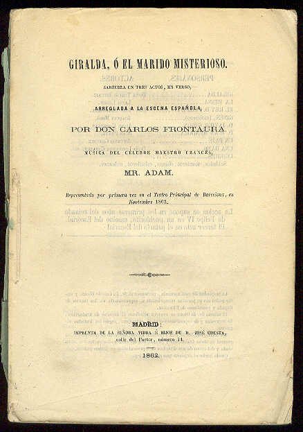 Giralda, o el marido misterioso. (Zarzuela en tres actos, en verso. Representada por primera vez en el Teatro Principal de Barcelona, en Noviembre de 1862) / Arreglada a la escena española, por.; Música del célebre maestro francés. Mr. Adam | Libri antichi e moderni | Frontaura, Carlos