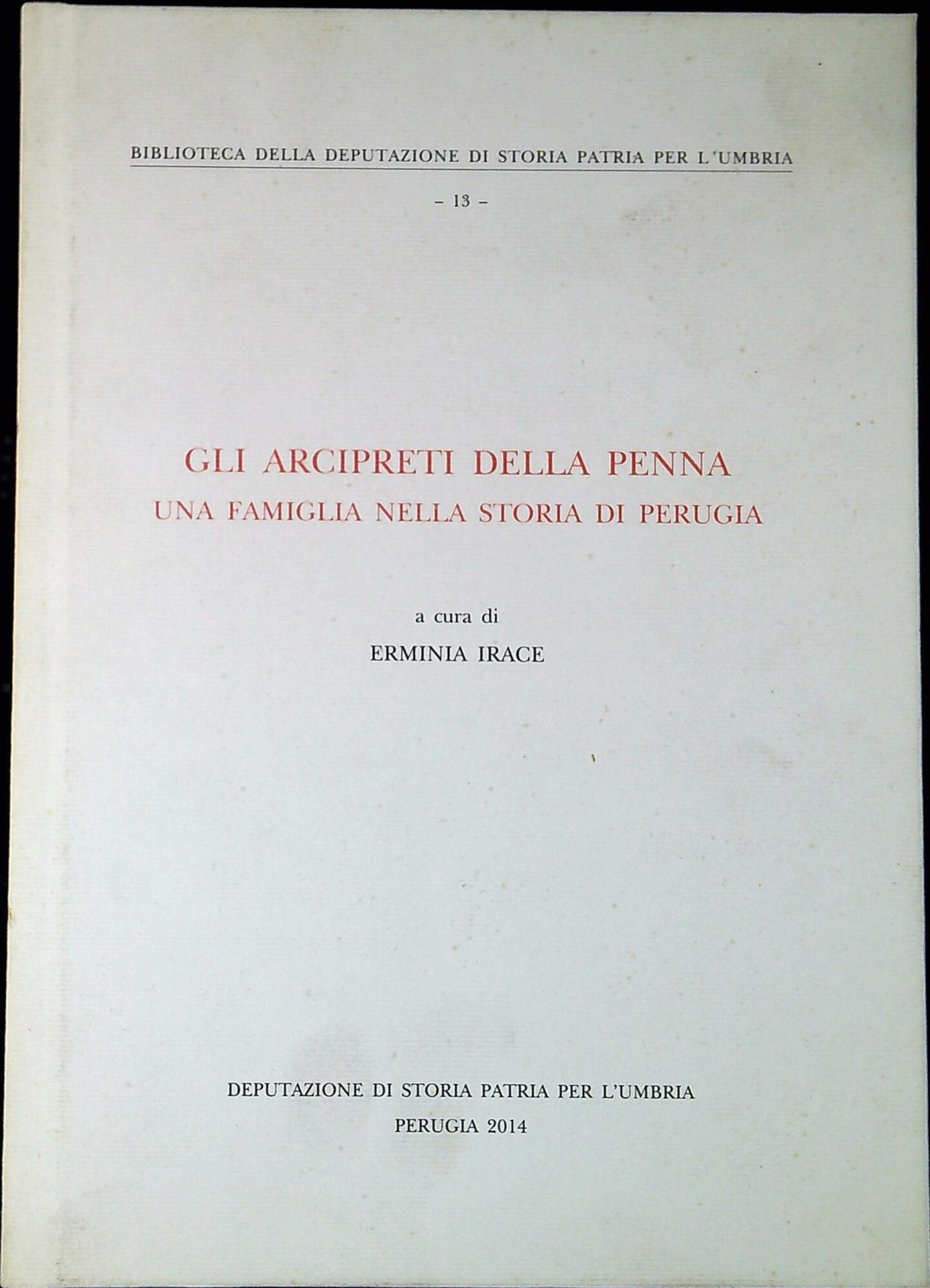 a cura di Erminia Irace Gli Arcipreti della Penna : una famiglia nella storia di Perugia. Perugia, Deputazione di storia patria per l'Umbria 2014, X, 350 p., [16] carte di tav. di cui 8 ripiegate : ill. ; 24 cm (58897)