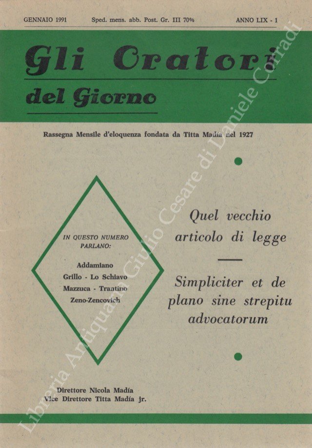 Gli oratori del giorno. Rassegna mensile d'eloquenza. Anno LIX - Numero 1. Gennaio 1991 | Libri antichi e moderni | Mazzucca T. - Zeno Zencovich V. Et Alii