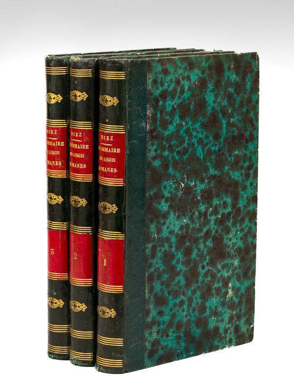 3 vol. in-8 reliure demi-basane verte, bei Eduard Weber, Bonn, 1858-1860, Esrter Theil : Zweite, neu verfaßte Ausgabe , 1858, VI-482 ; zweiter Theil : Zweite, umgearbeitete Ausgabe, 1858, 471 Seiten ; Dritter Theil : zweite Ausgabe, 1860, VI-476 Seiten Importante seconde édition de la "Grammaire des langues romanes" du philologue allemand Friedrich Diez (1794-1876). Etat très satisfaisant (une coupe fort. frottée, un coin plié, dernier feuillet partiellement contrecollé contre la dernière garde volante, bon état par ailleurs).
