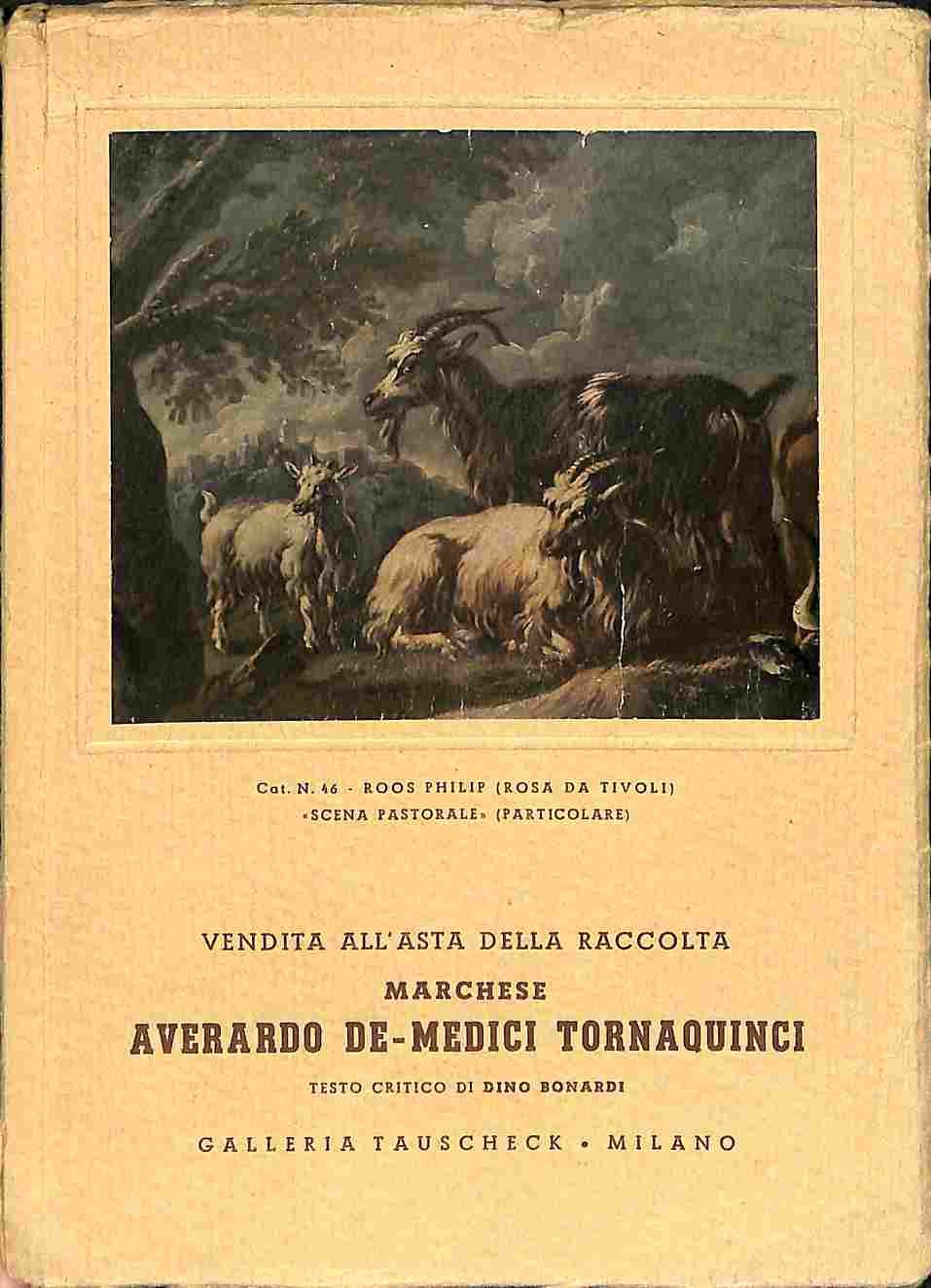 In 8 (cm 15 x 21), pp. 78 + (2) con 43 tavole con riproduzioni in bianco/nero di dipinti. Brossura editoriale con illustrazione a colori applicata al piatto anteriore (lieve danno riparato al dorso). Catalogo della vendita all'asta, tenutasi presso la Galleria Tauscheck di Milano nel 1954, della raccolta di opere d'arte del Marchese Averardo De-Medici Tornaquinci. Nel 1955 usci' un altro catalogo con la seconda parte della vendita.
