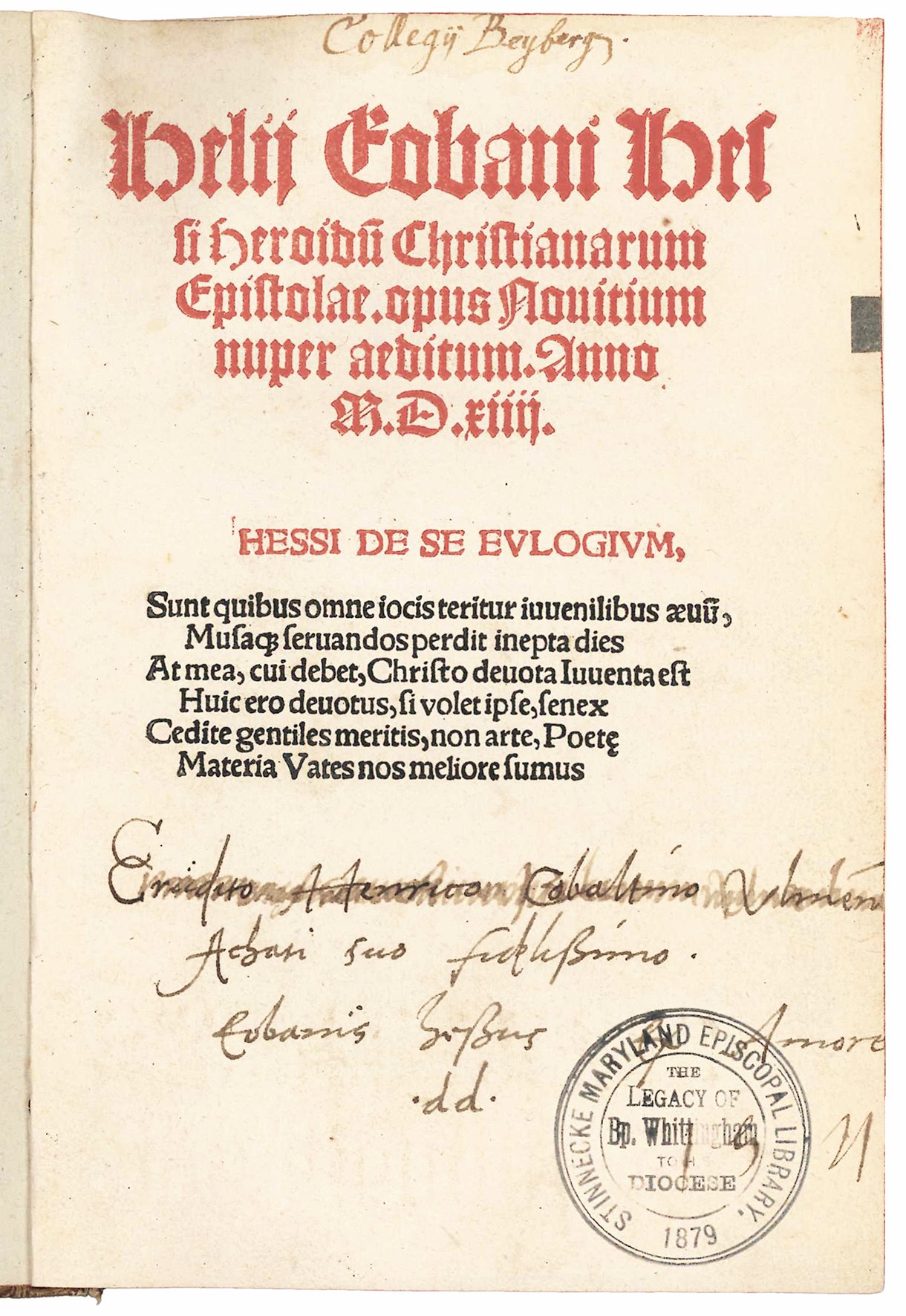 On the title page autograph dedication by the author to Heinrich Kobolt from Ulm (1490-1521): “Erudito Henrico Cobaltino Ulmeñ Arbori suo sublissimo Eobanus Hessus cum Amore dd. 1521”. Above is a later ownership entry “Collegii Beybergj”.