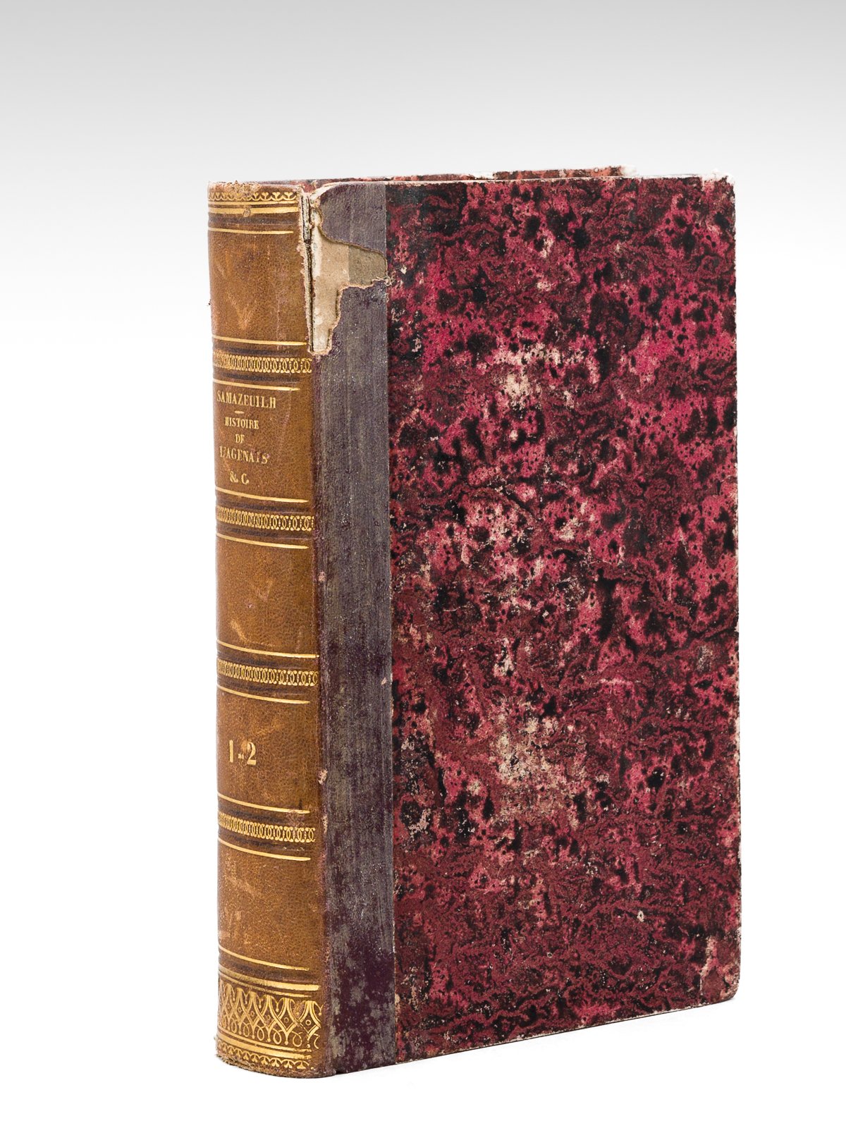 1 vol. in-8 reliure de l'époque demi-basane marron, Impr. J. Foix, Auch, 1846 et 1847, XI-480 pp. et 2 ff., XVII-533 pp. Dans sa bibliographie de l'Agenais, Andrieu évoque un "ouvrage remarquable, le meilleur travail d'ensemble qui ait été publié jusqu'à ce jour sur nos régions. Rare et très recherché". Etat satisfaisant (dos frotté avec mq. de cuir en mors, belle fraîcheur intérieure). Andrieu, III, 273