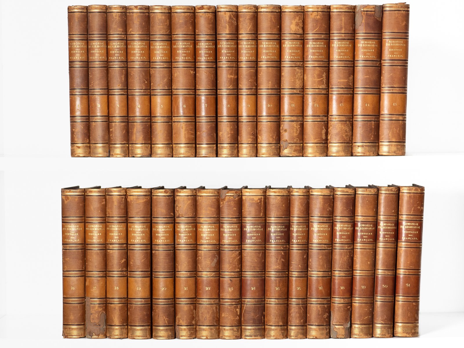 31 vol. in-8 reliure de l'époque demi-veau blond, dos lisse, Treuttel et Würtz, Paris, 1821-1844 Rare exemplaire bien complet des 31 tomes (le tome 31 étant la table alphabétique générale) de l'impressionnante "Histoire des Français" de l'économiste et historien suisse Jean de Sismondi (1773-1842). Influencé dans ses débuts par Adam Smith et Ricardo, il s'en distingue en 1819 en publiant ses "Nouveaux principes d'économue politique", dans lesquels il critique un libéralisme générateur de crises de surproduction affectant durement les populations. S'étant intéressé à l'histoire des Républiques italiennes au moyen-âge, Sismondi fut ensuite conduit à se tourner vers l'histoire de la France qui influença tant l'histoire de l'Europe. Protestant, il se veut rationaliste et critiquera l'Histoire de France de Jules Michelet auquel il écrira : "Je n'ai pas besoin de vous dire que je suis protestant et reste rationaliste en sorte que l'avidité de foi qui vous fait adopter avec d'autant plus d'ardeur, d'autant plus d'émotion une croyance qu'elle est plus mystique, est une disposition toute contraire à celle avec laquelle j'ai considéré les mêmes faits". Etat satisfaisant (manques de cuir en dos de volumes, bon état par ailleurs).