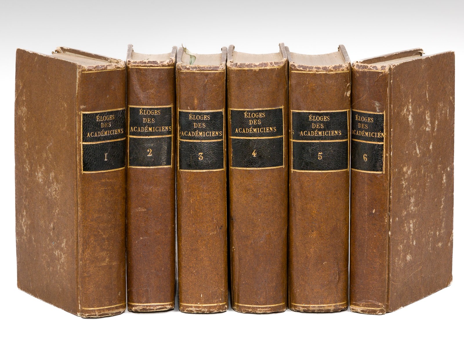 6 vol. in-12 cartonnage bradel postérieur, Chez Moutard, Imprimeur-Libraire de la Reine, de Madame, de Madame Comtesse d'Artois, & de l'Académie des Sciences, A Paris, 1787, xxxiv-vi-559 pp. et 2 ff. n. ch. ; 2 ff., xii-437 pp. ; 2 ff., 523 pp. ; 2 ff., 637 pp. ; 2 ff., 668 pp. ; 2 ff., 378 pp. Le tome premier est la remise en vente, avec page de titre modifié, des " Éloges lus dans les séances publiques de l'Académie françoise" publiés par d'Alembert en 1779 (le privilège demeurant celui des "Eloges", accordé en 1778) ainsi que le précise Quérard. "Ce premier volume composé d'un choix d'Eloges de d'Alembert a été publié par l'auteur lui-même, tandis que les cinq autres l'ont été par Condorcet, après la mort de d'Alembert. Condorcet n'a pu suivre, dans l'impression de ces cinq vol., l'ordre chronologique que les éditeurs des oeuvres de d'Alembert ont adopté comme le plus naturel" (Quérard, I, 25). Etat très satisfaisant (manque la moitié des ff. de faux-titre et de titre du tome troisième, avec ancienne restauration, rel. lég. frottée, qq. mouill. assez discrètes, bon état par ailleurs).
