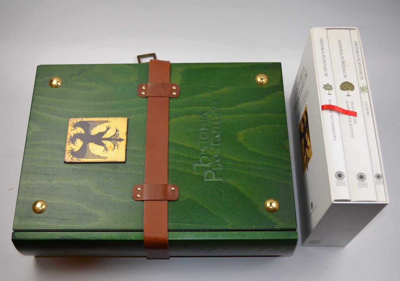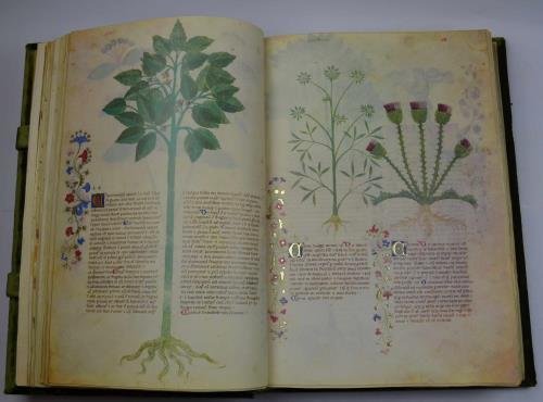 Cm. 44 x 30, pp. 590. Interamente stampato a colori con particolari rialzati in oro. Sontuosa legatura in pieno velluto verde con borchie metalliche e lacci di chiusura. Protezione in pelle e custodito in una scatola in legno con chiusure in pelle. Accompagnato dal testo di commento formato da due volumi + un allegato CD. Entro custodia in cart. rigido. Il tutto in perfetto stato di conservazione, come nuovo. Tiratura limitata di 750 esemplari numerati (ns. n. 153). Si tratta della splendida riproduzione del Ms. 459 presente alla Biblioteca Casanatense di Roma, noto anche come Tacuinum Sanitatis.