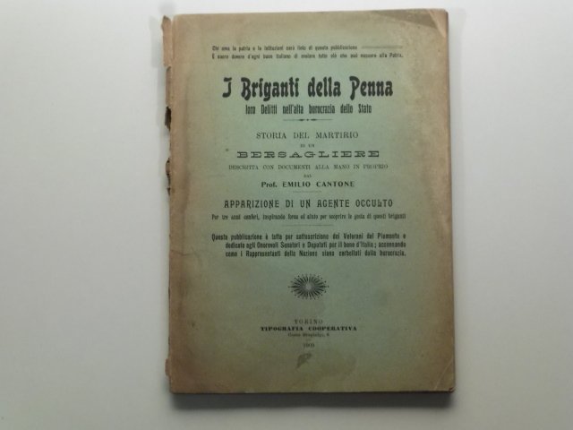 I briganti della penna, loro delitti nell'alta burocrazia dello Stato; Storia del martirio di un bersagliere descritta con documenti alla mano in proprio | Libri antichi e moderni | Cantone Emilio