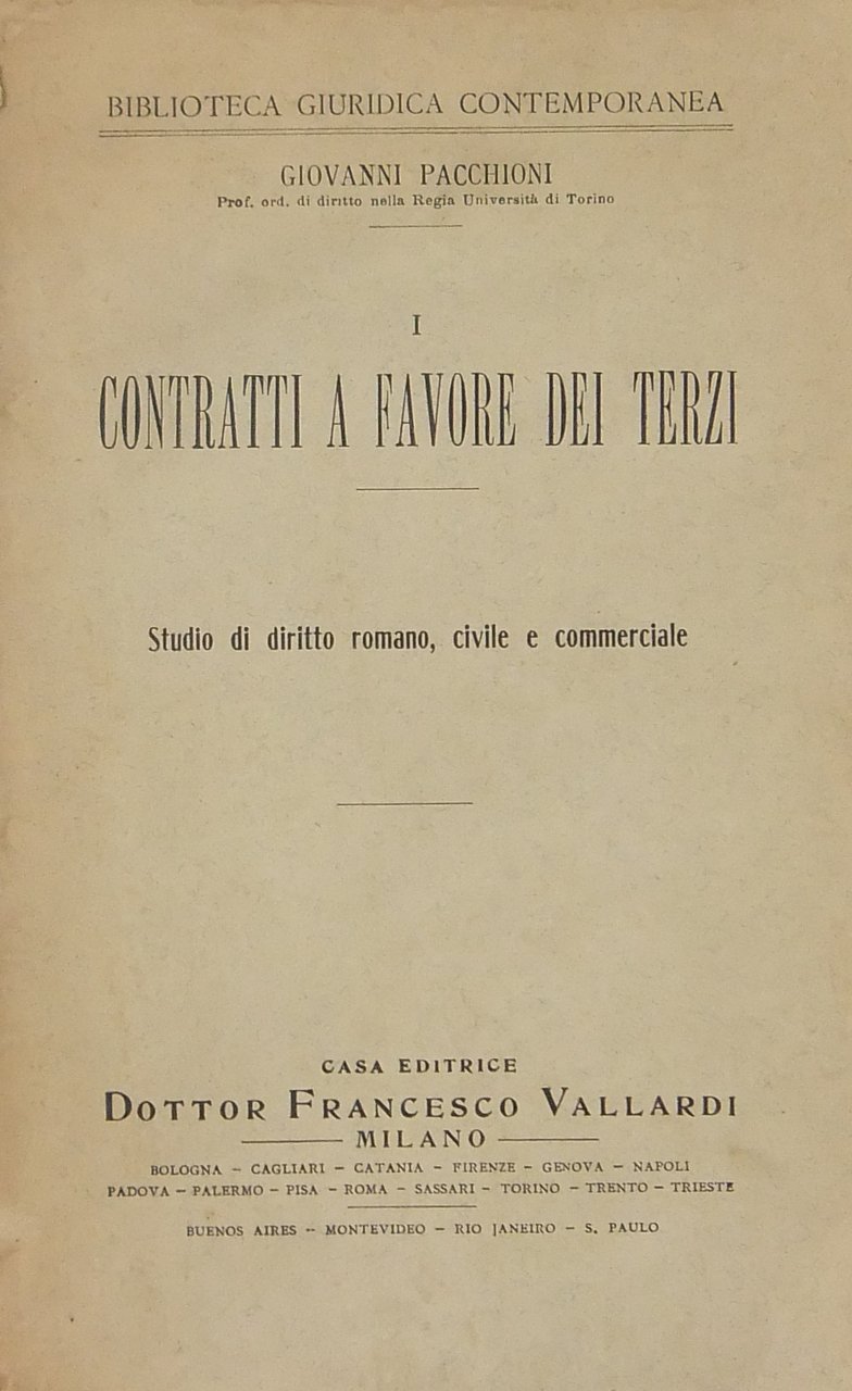 I contratti a favore di terzi. Studio di diritto romano, civile e commerciale | Libri antichi e moderni | Pacchioni Giovanni (1867-1946)