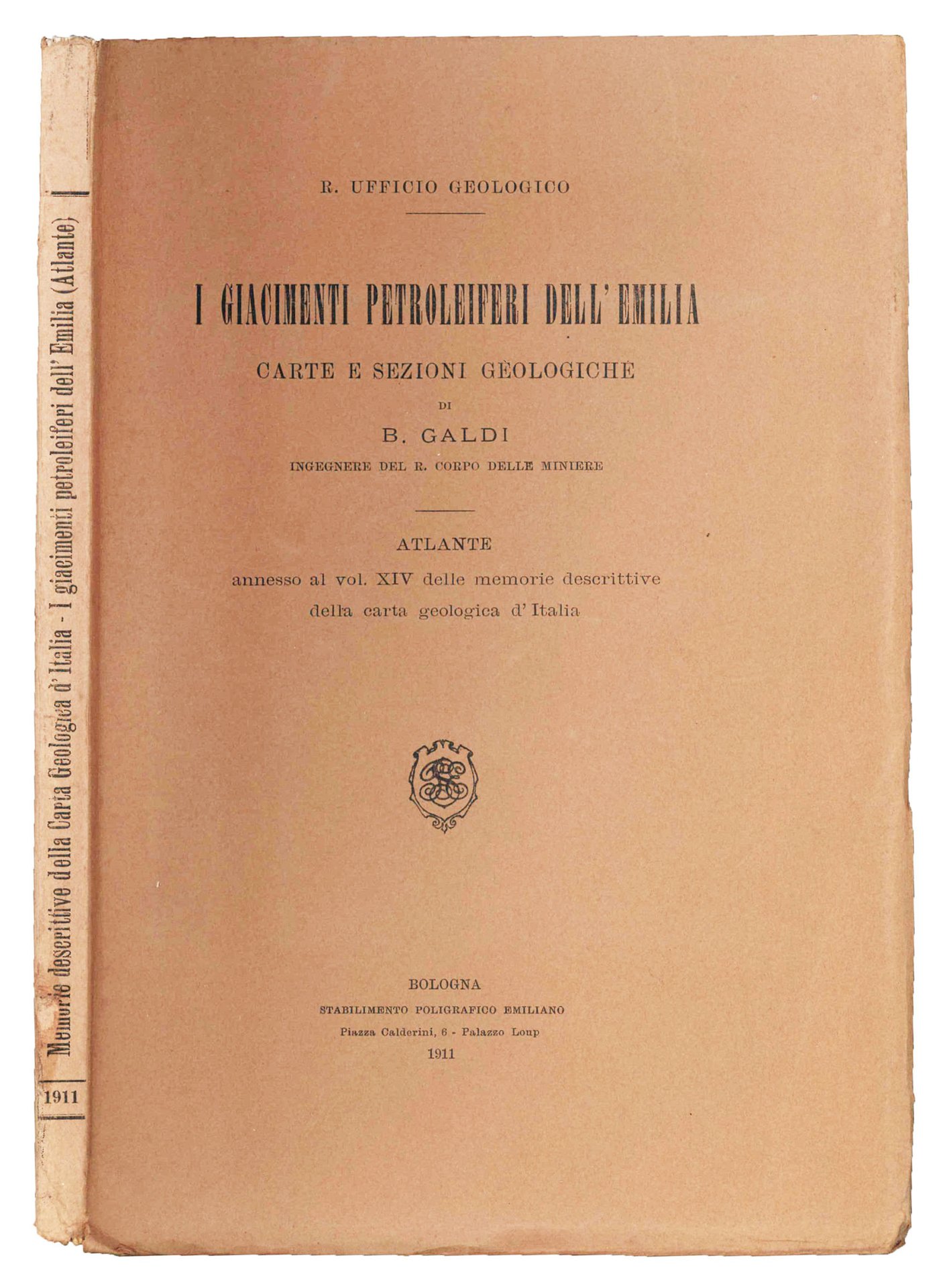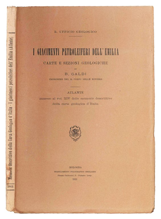 Mm. 265x185. XVI cc. di tavv. in b/n più volte ripiegate che illustrano i bacini dei fiumi emiliani. Prime cc. lievemente fiorite. Brossura editoriale con titolo e marca editoriale alla cop. ant. prima edizione contenente carte e sezioni geologiche di B. Galdi, ingegnere del R. Corpo delle Miniere. Atlante annesso al vol. XIV delle Memorie descrittive della carta geologica d'Italia.