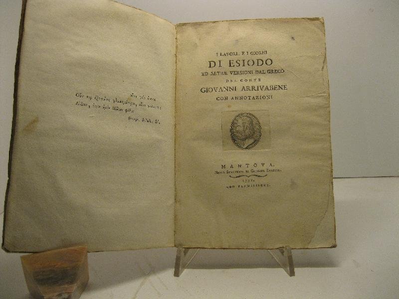 In 8, pp. 182 + (1) + (1) di errata. Piccolo ritratto raff. Esiodo inciso al front. Cartonat. rifatta con carta antica a stampa marmorizzata. Traduzione in versi sciolti delle Opere e i giorni di Esiodo con testo greco a fronte. Seguono le traduzioni di alcuni idilli (La morte di Adone, In morte di Bione ecc.). Le traduzioni sono precedute da una prefazione sull'opera di Esiodo. Arrivabene, di origine modenese, fu un uomo di affari e letterato che soggiorno' per qualche tempo a Vienna. La sua traduzione della maggiore opera di Esiodo e' considerata fra le migliori del XVIII secolo.