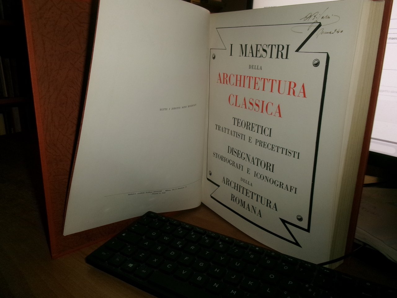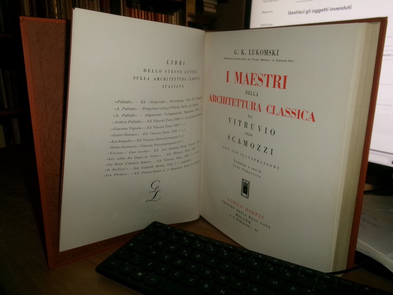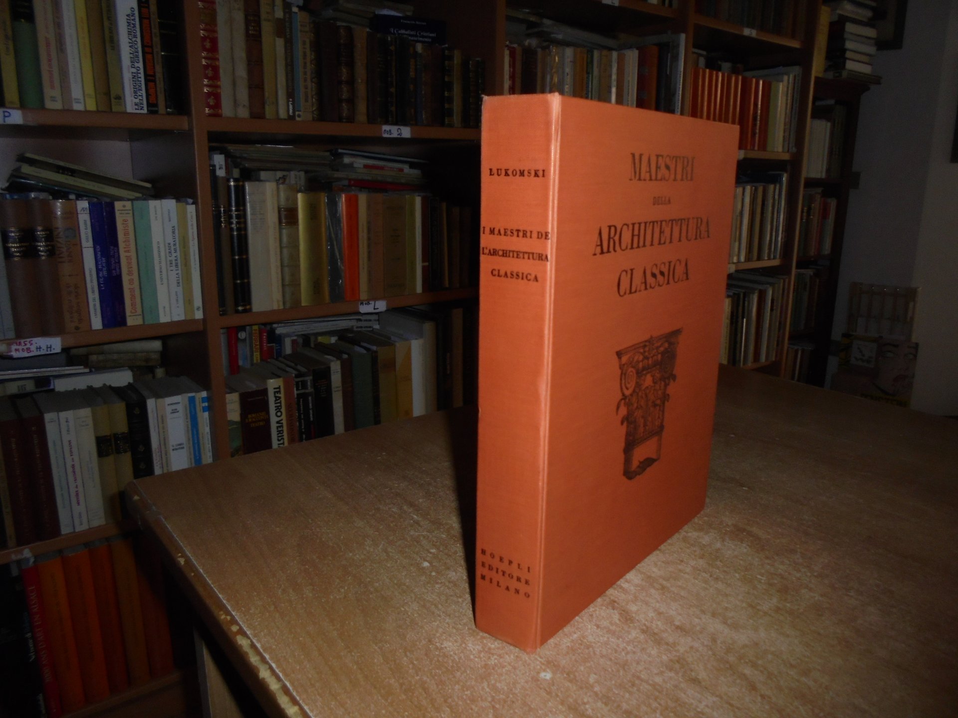 G. K. LUKOMSKI. Milano, Ulrico Hoepli Editore, 1933. I MAESTRI della ARCHITETTURA CLASSICA da VITRUVIO allo SCAMOZZI. Teoretici Trattatisti e Precettisti Disegnatori Storiografi e Iconografi della Architettura Romana. In-8° grande, tela edit. con titoli in nero sul piano e al dorso XIII, 455 pp. con 350 illustrazioni. Traduzione a cura di Lino Cappuccio. Ottimo esemplare. Neg. mob. C