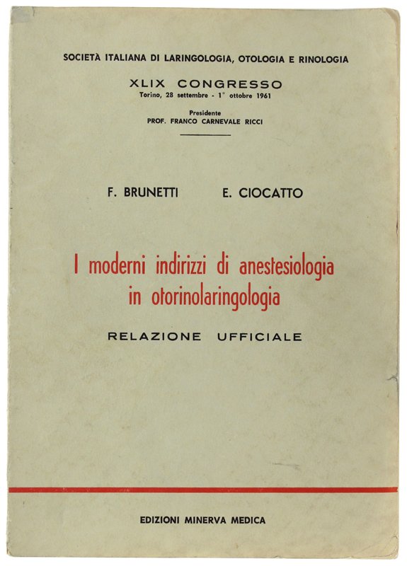I MODERNI INDIRIZZI DI ANESTESIOLOGIA IN OTORINOLARINGOLOGIA. XLIX. Congresso : Torino, 28 settembre - 1 ottobre 1961 Relalzione ufficiale. | Libri antichi e moderni | Brunetti F., Ciocatto E. (A Cura)