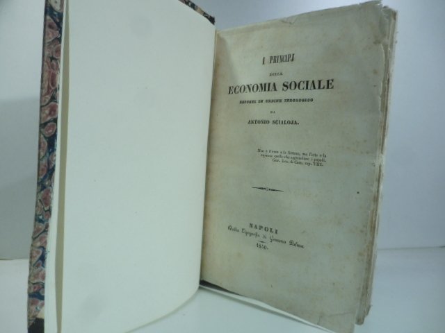 In 8, cm 13,5 x 21, pp. 380. Mezza pelle coeva con angoli. Fregi oro al dorso e tasselli. Frontespizio con leggero foxing, pressoche' esente nelle seguenti pagine di testo. Esemplare intonso. Edizione originale rara di questo trattato di economia politica, considerato uno dei piu' importanti del XIX secolo. Scritto a soli 23 anni, nei Principj vengono presentati i fondamentali teoremi della scienza economica. Questi verranno rivisti e tradotti in francese nel 1844, mentre, nel 1846, a Torino, dove era stato chiamato a ricoprire la cattedra di Economia politica, Scialoja pubblichera' una seconda edizione e, nel 1848, redigera' per Pomba un Trattato elementare di economia sociale. L'uscita di questo testo mettera' Scialoja al centro dell'attenzione del mondo culturale napoletano, richiamando recensioni positive come quella di Mancini, che accosta il suo pensiero a quello di Ricardo, o quella di De Augustinis che, pur elogiandolo, lo critichera' per l'eccesso di sicurezza. Considerato come uno degli architetti del pensiero economico risorgimentale, Scialoja ebbe modo di applicare le sue teorie come ministro dell'agricoltura, commercio ed economia nei governi di Carlo Troia, durante il governo provvisorio di Garibaldi, nel primo governo Ricasoli ecc. Augello-Guidi, L'economia divulgata, p. 3-6. Goldsmiths, 31364. Manca a Cat. Einaudi.