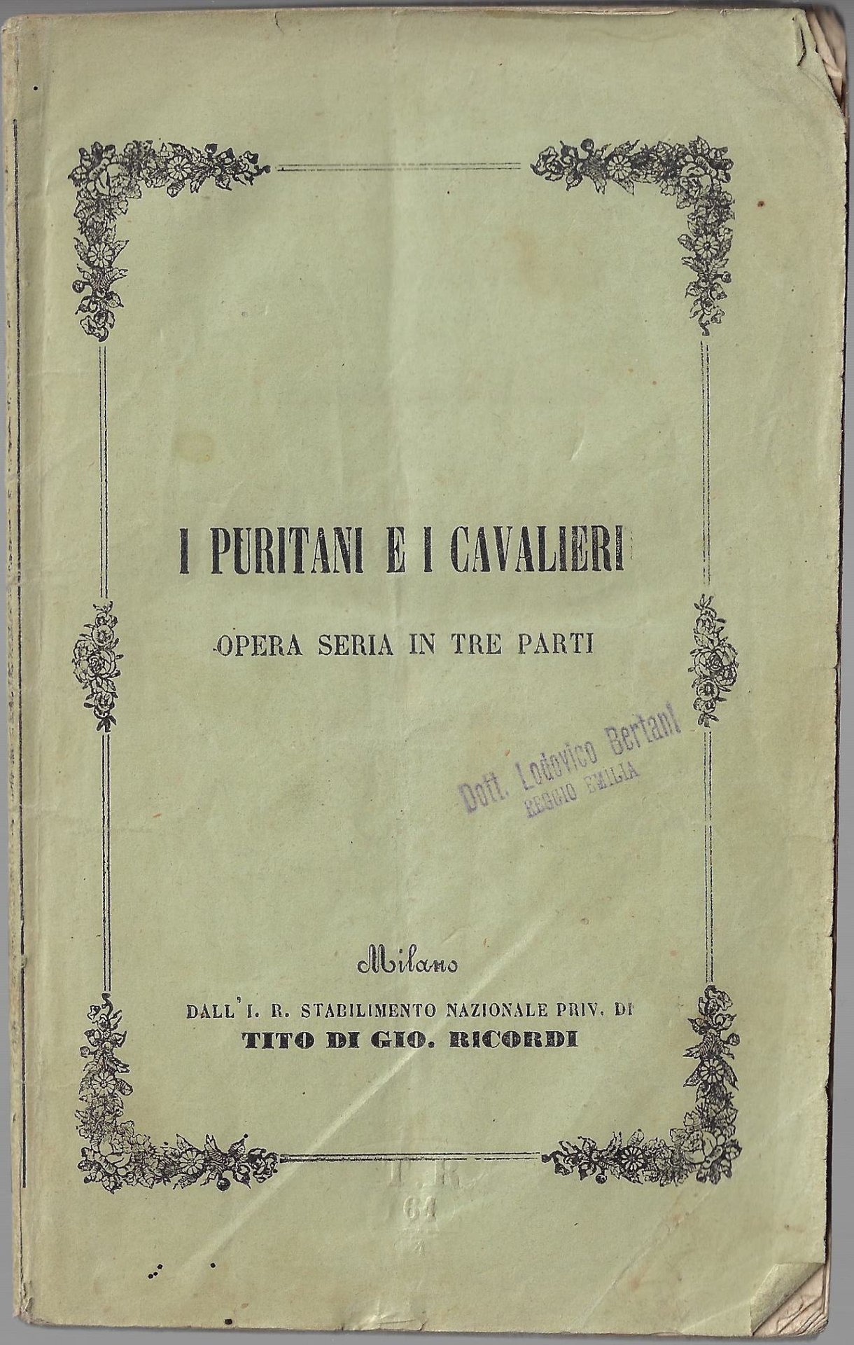 43 p. Libretto d'opera, musica di Vincenzo Bellini Buono (Good) Timbro di appart. al frontespizio, piccole fioriture, la pagina dei personaggi vede applicata, sotto una scritta a matita recante: Bologna 1888, una pecetta che ricopre col nome di altri intepreti i nom originariamente stampati.