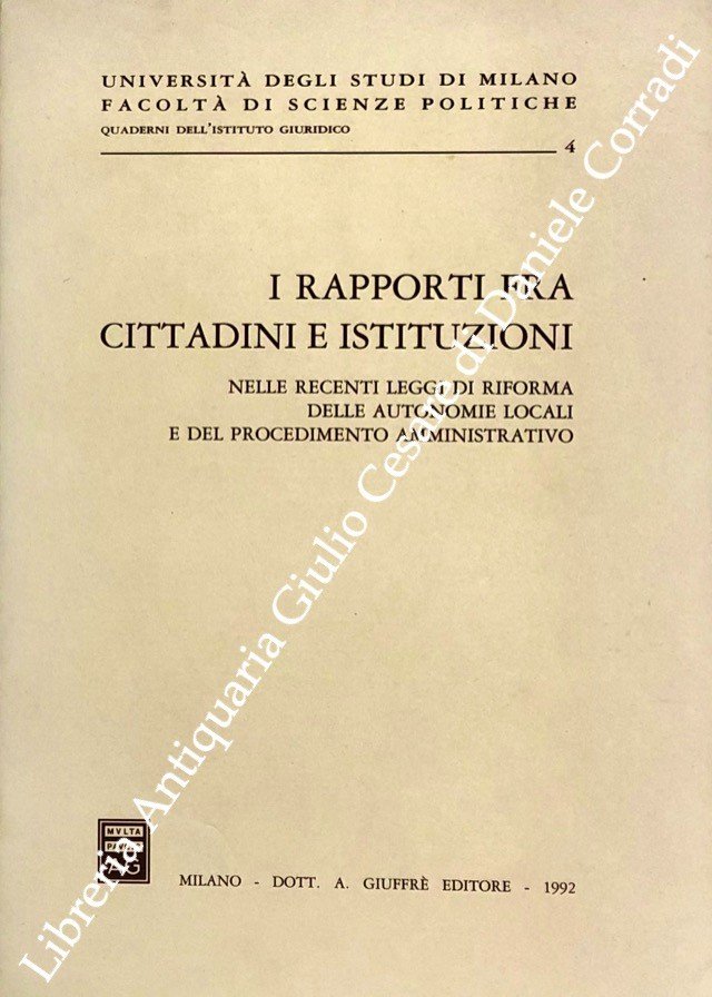 I rapporti fra cittadini e istituzioni nelle recenti leggi di riforma delle autonomie locali e del procedimento amministrativo. Atti del Convegno tenutosi il 14 gennaio 1991 | Libri antichi e moderni | Italia Vittorio Et Alii
