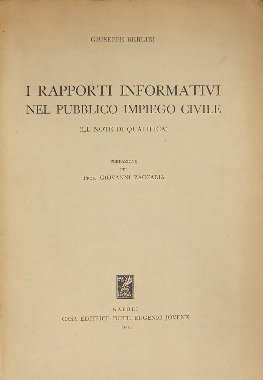 I rapporti informativi nel pubblico impiego civile. (Le note di qualifica). Prefazione del Prof. Giovanni Zaccaria | Libri antichi e moderni | Berliri Giuseppe