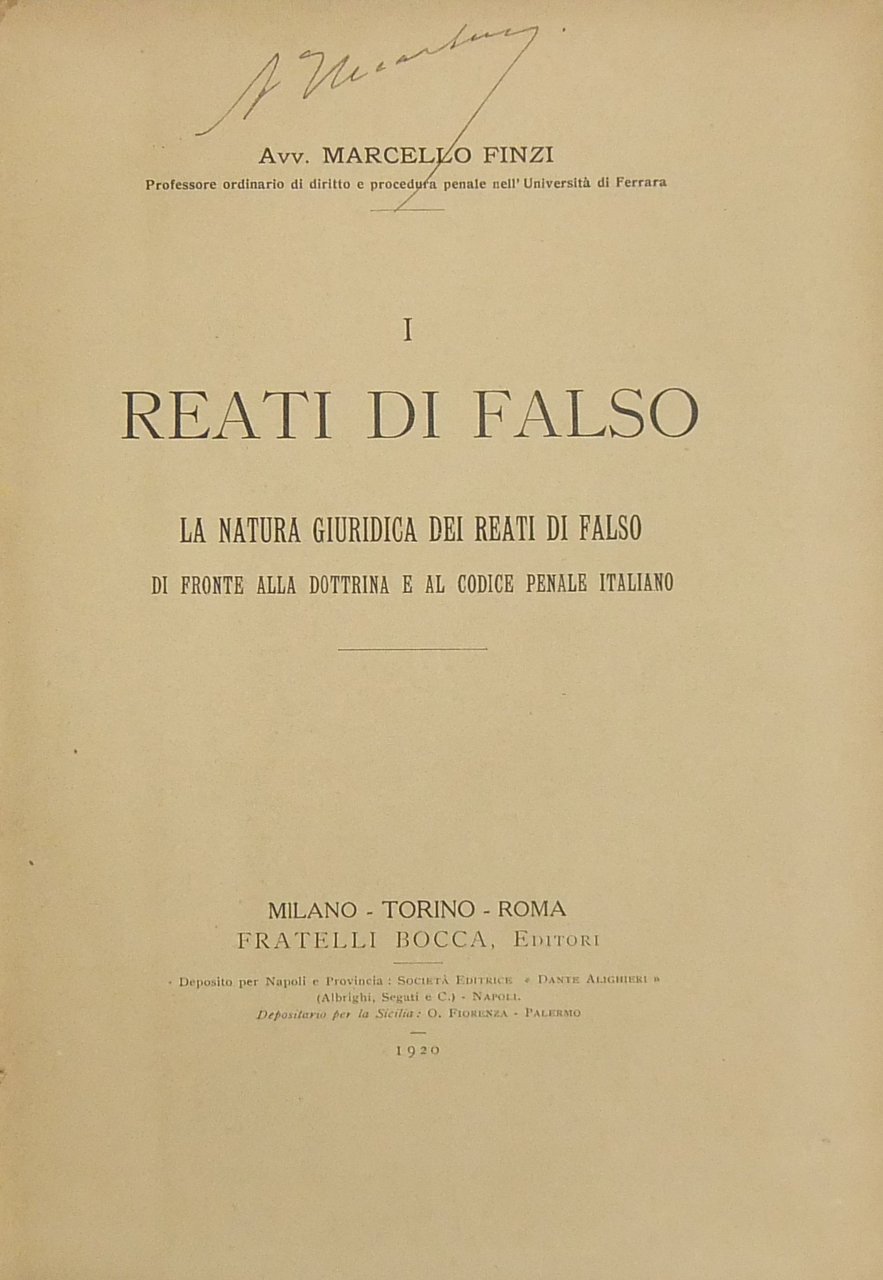 I reati di falso. La natura giuridica dei reati di falso di fronte alla dottrina e al codice penale italiano | Libri antichi e moderni | Finzi Marcello