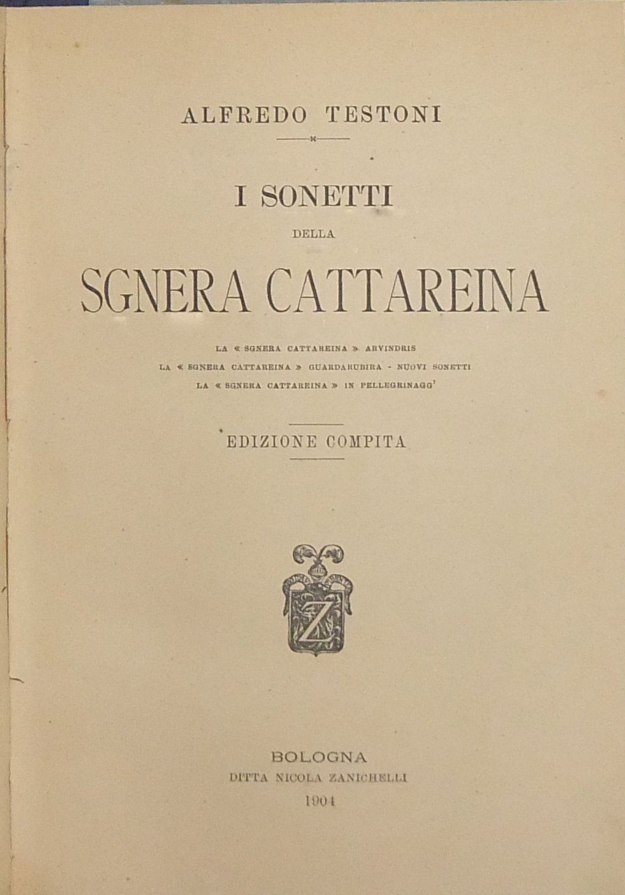 I sonetti della Sgnera Cattareina. La Sgnera Cattareina arvindris. La Sgneira Cattareina guardarubira. Nuovi sonetti. La Sgnera Cattareina in pellegrinagg' | Libri antichi e moderni | Testoni Alfredo (1856-1931)