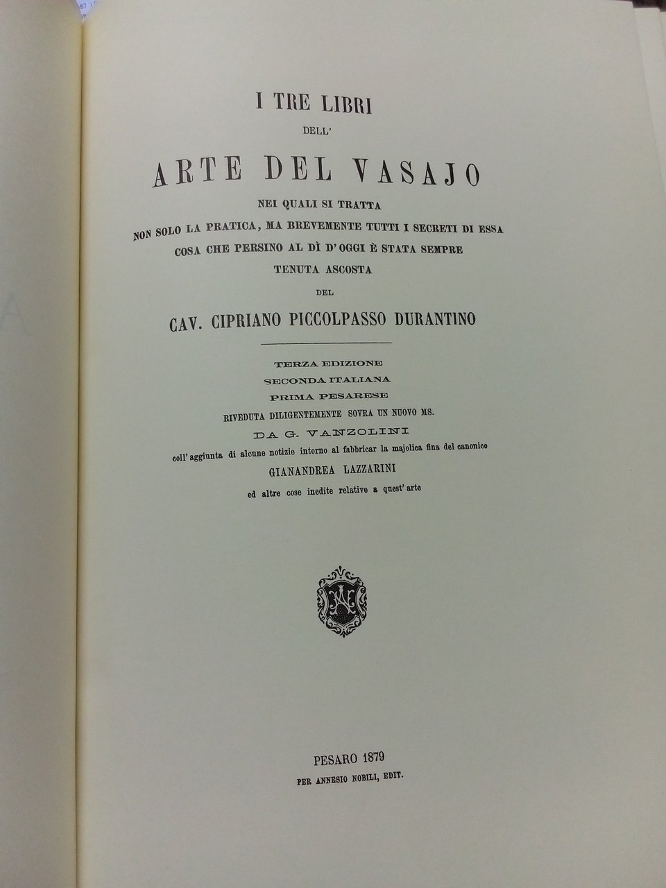 I tre libri dell'arte del vasaio. Riveduti da G. Vanzolini. Con aggiunte di G. Lazzarini.