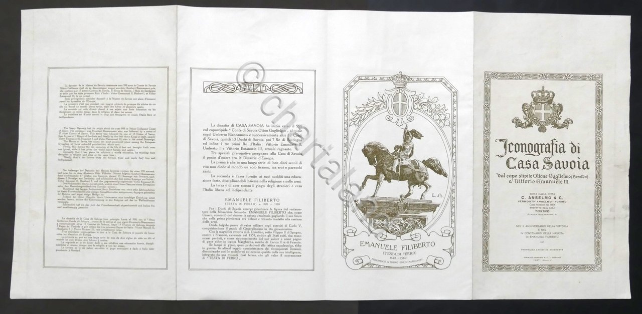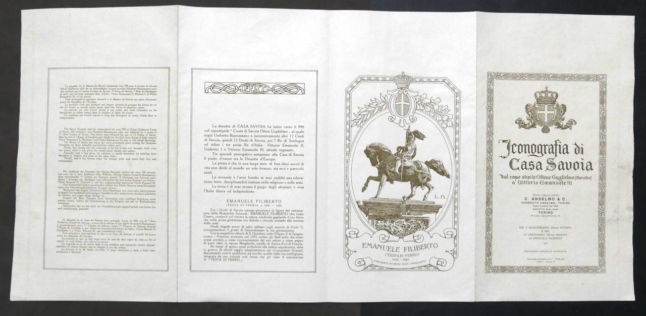 Iconografia di Casa Savoia dal capostipite Ottone Guglielmo a Vittorio Emanuele III - 19274 pagine ripiegate a fisarmonica. Copertina morbida - Lingua italiana. Condizioni generali buone.