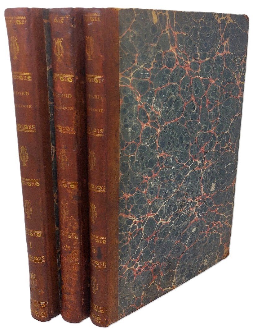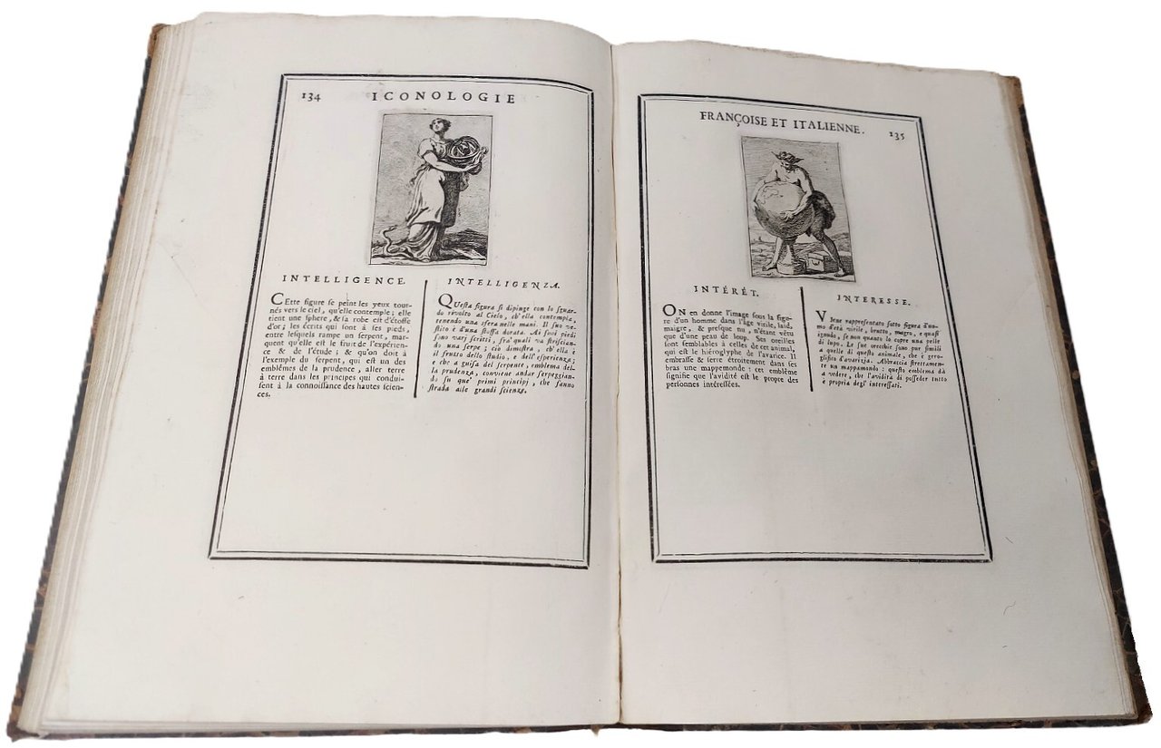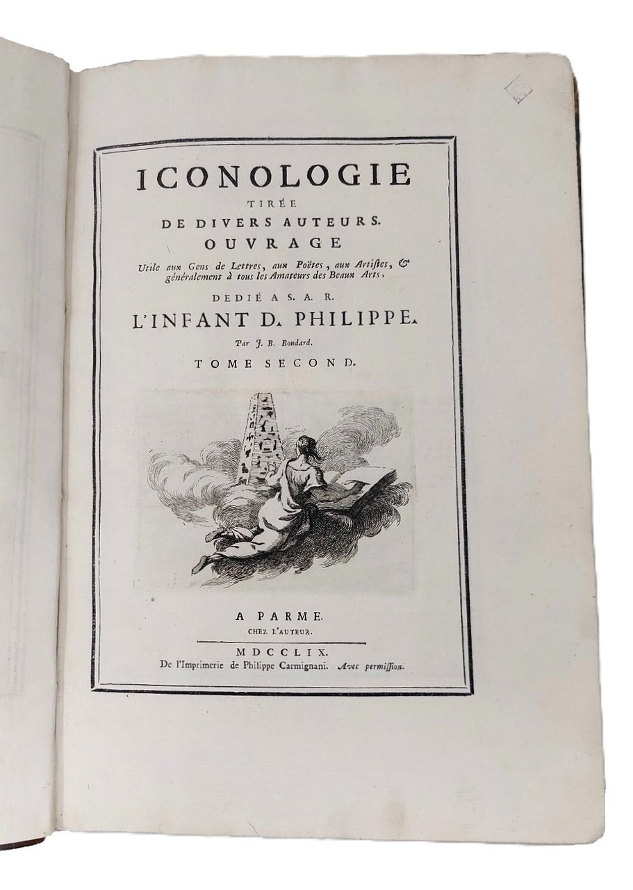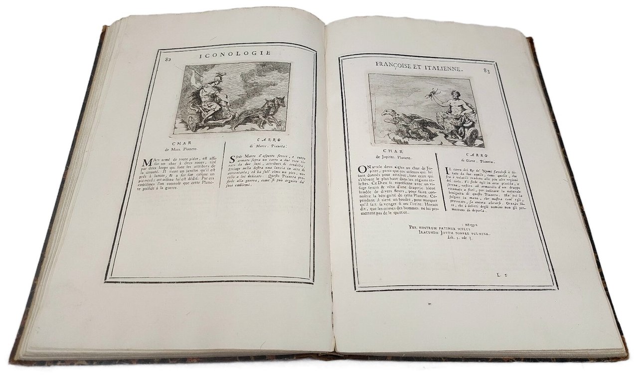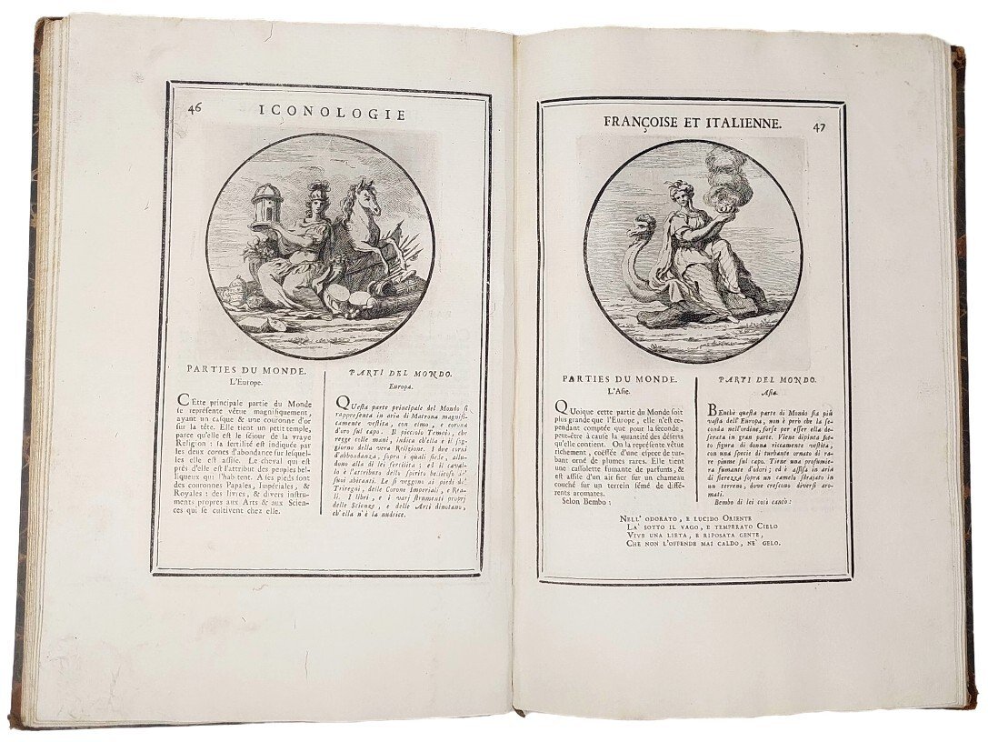 >3 volumi in-folio (320x215 mm), pp. (6 di occhietto, frontespizio e dedica incisi), 16 preliminari, 103, (9 di Imprimatur e Indici); (4 di occhietto e frontespizio), 219, (9 di Imprimatur e Indici); (4 di occhietto e frontespizio), 208, (8 di Indici e Imprimatur), vignette incise ai tre frontespizi, bella testatina nel proemio, pagine entro cornice tipografica, Imprimatur e Licenza della Reale Accademia Parmense in fine a ciascun volume. Legatura coeva in mezza pelle e angoli, piatti in cartone decorato, titolo e fregi in oro al dorso (segni d'uso agli angoli e restauri al dorso del secondo volume). Prima edizione, rara. L'imponente opera impressa a Parma presenta 630 emblemi incisi all'acquaforte, di diverse misure, con testo bilingue in francese e traduzione italiana a cura dell'amico Abate Giuseppe Pezzana. L'Iconologie è un'opera monumentale, organizzata in ordine alfabetico come se fosse un dizionario artistico e visuale di emblemi: vizi, virtù morali, emozioni umane, figure mitologiche e concetti filosofici. L'opera fu poi ristampata in formato piccolo, a Vienna, ma l'edizione di Parma, impressa nitidamente su carta forte e in folio è superiore, oltre che rara. Splendido esemplare, a pieni margini (pochissime e sporadiche macchiette), minuscolo timbro di ex-libris all'angolo sup. di diversi fogli nei tre volumi (strappetto abilmente restaurato alla tavola 100), Praz p.28 (con diversa collazione).