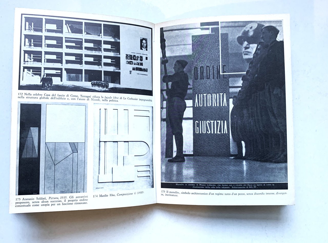 III riveduta e corretta ed.: settmbre 1975, ma finito di stampare nell'ottobre 1975 (I ed.: maggio 1973). Collana Cultura e Classe 7. VIII piccolo/ 168/ brossura patinata con grafica in b/n/rosso e con illustrazioni a colori ai piatti (bambine, al primo piatto, e bambini, all'ultimo piatto dell'Opera Nazionale Balilla. Illustrazione). Con illustrazioni in b/n e a colori in tavole patinate f.t.. Stato buono (copertina e pagine brunite). Indice: Premessa; U. S. - L'ideologia fascista (Il problema dell'ideologia fascista (La base economica di classe dell0ideologia fascista - L'ideologia fascista come ideologia d'esportazione) - La piccola borghesia in crisi - Capitalismo monopolistico e manipolatore (Borghesi e proletari uniti nella rotta - Sociopsicosi delle masse - Illustrazioni da 1 a 80) - Gli intellettuali e la costruzione dell'ideologia fascista (Il rifiuto delle ideologie - Mosaico di scarti) - Rifiuto della psicosi e ideologia socialdemocratica (Per un neoideologismo illuminato - Il suicidio dell'ultima ideologia) - Teoria e pratica della coazione psichica (Metodi, meccanismo e gradi del totalitarismo) - Filosofia fascista (Relativismo come opportunismo - Attualismo per "essere presenti!")) - Miti e riti del fascismo (L'ideologia fascista come mitologia (Il mito come realtà - Mito e tempo, fine della storia) - Miti di identificazione (Carismi personali - Deus otiosus e demiurgi - Miti di gruppo - Razzismo materiale e spirituale - Illustrazioni da 81 a 105) - Il rituale fascista (Le origini del rituale fascista - Dall'arte alla politica - L'artista, l'opera, i costumi ed il gesto - "Giovinezza eterna malattia" - Il "teatro" delle operazioni - Illustrazioni da 106 a 150 - Dioniso o Apollo?)) - Il fascismo e l'arte (Per un'arte fascista (Chiarezza e semplicità - Contenutisti e formalisti - Arte e Stato) - Movimenti artistici e fascismo (Né socialismo né fascismo - Scolaretti imperialisti e sacrileghi - Gli dei son belli dopo la morte - Illustrazioni da 151 a 190 - Pennello e manganello - Il sonno dei mostri genera la ragione - Da Cremona a Bergamo - Ruderomania e neoclassicismo)) - La mitologia fascista e le dottrine dell'epoca (Mitologia fascista e pensiero marxista (Dal blanquismo al populismo - Fascismo e revisionismo - La "rivoluzione" fascista e le altre parodie - Illustrazioni da 191 a 216) - Mitologia fascista e mitologia cvattolica (L'antefatto: la questione della scuola - Religio instrumentum regni - Un amore contrastato - Fascismo cattolico - Dioniso contro il crocifisso) - Mitologia fascista e mitologia nazista (Giulio Cesare e Sigfrido - Futuristi degenerati - Illustrazioni da 217 a 248 - Verso Thanatos, con furore e prudenza)) - Appendice.