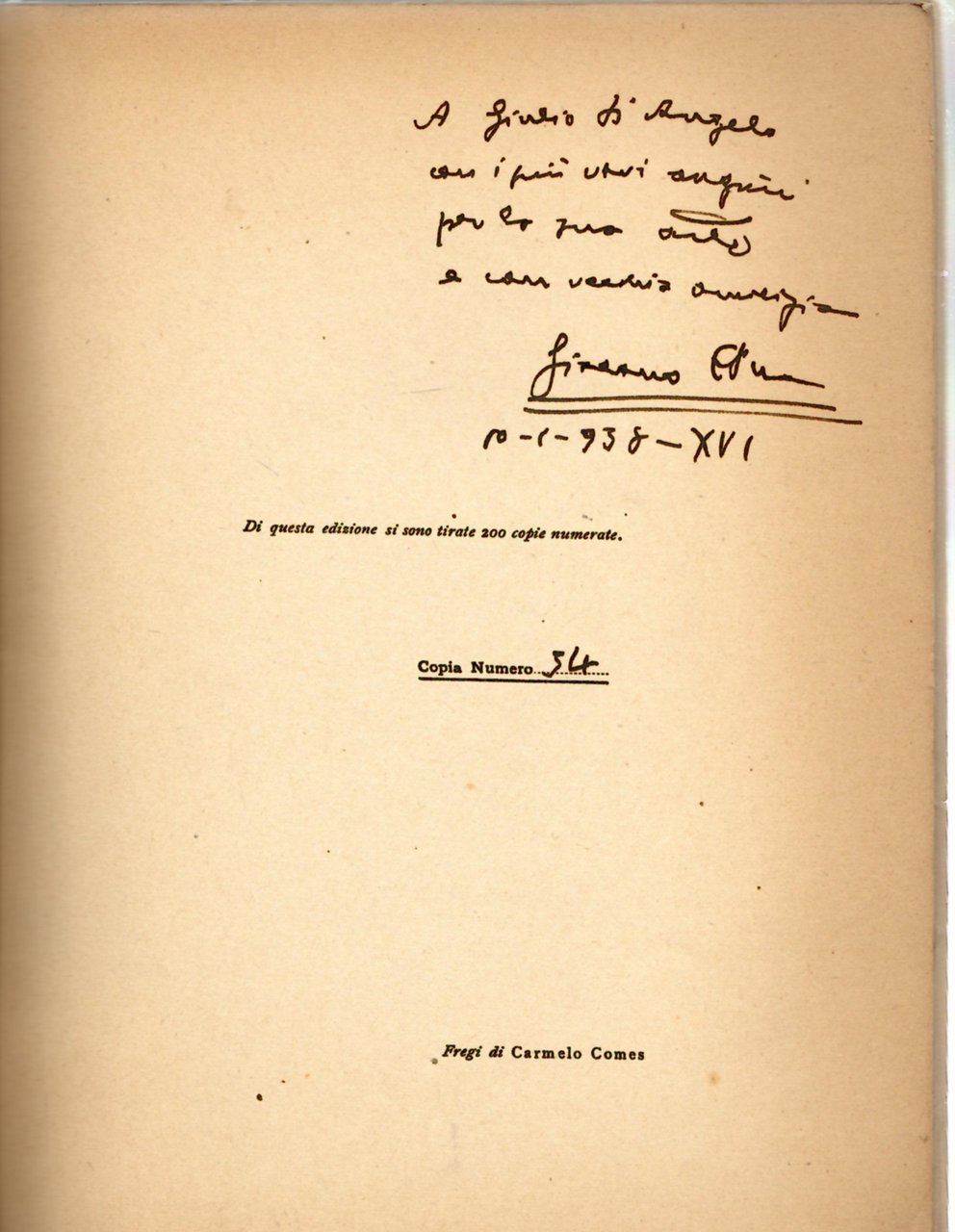 Prima edizione. Brossura editoriale di pagine 57, fregi di Carmelo Comes. Edizione numerata di 200 esemplari, copia numero 54. Dedica autografa dell'autore. Un po' ingiallito ma ottimo esemplare