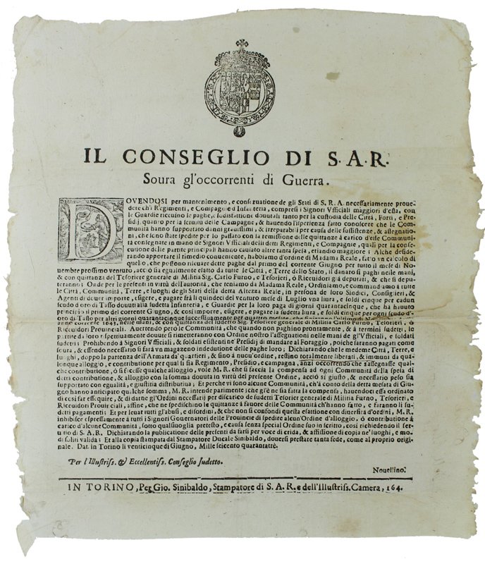 IL CONSEGLIO DI S.A.R. Sovra gl'0ccorrenti di Guerra. DOVENDOSI PER MANTENIMENTO E CONSERVATIONE DE GLI STATI DI S.R.A. NECESSARIAMENTE PROUEDERE CH'I REGIMENTI, E COMPAGNIE D'INFANTERIA, | Libri antichi e moderni | Christiana Di Francia.