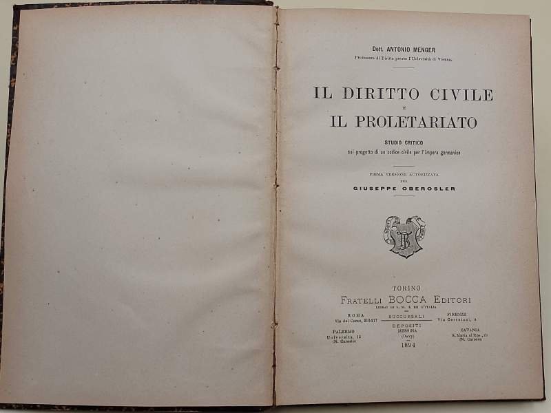 IL DIRITTO CIVILE E IL PROLETARIATO-STUDIO CRITICO SUL PROGETTO DI UN CODICE CIVILE PER L'IMPERO GERMANICO(1894) | Libri antichi e moderni | Menger Antonio