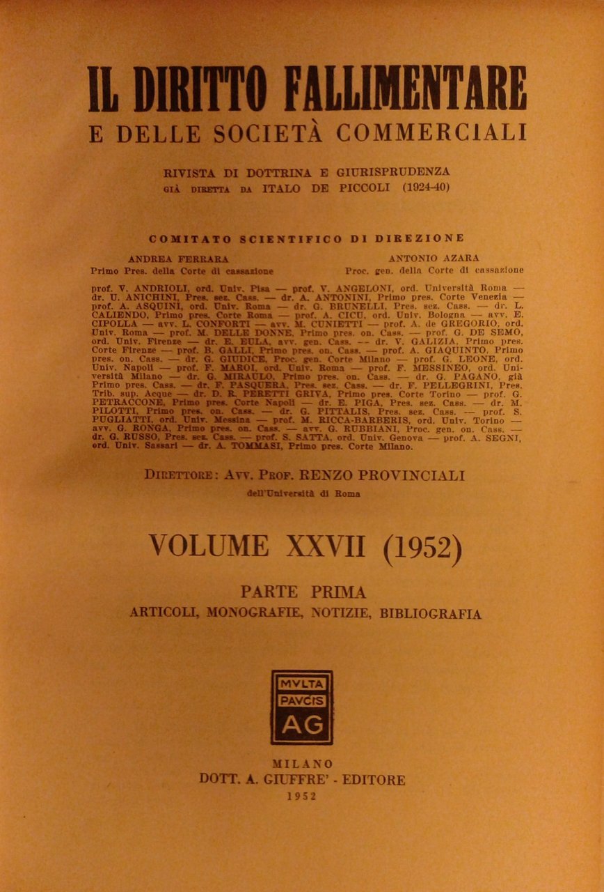 Il Diritto Fallimentare e delle società commerciali. Rivista di dottrina e giurisprudenza (già diretta da Italo De Piccoli 1924-1940). Vol. XXVII - 1952. Diretta da Renzo Provinciali | Libri antichi e moderni | Autori Vari