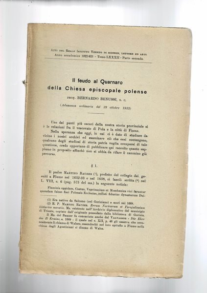 Il feudo al Quarnaro della chiesa episcopale polense. Estratto dagli Atti del Reale Istituto Veneto di scienze lettere e arti del 1922-1923. | Libri antichi e moderni | Benussi Bernardo.