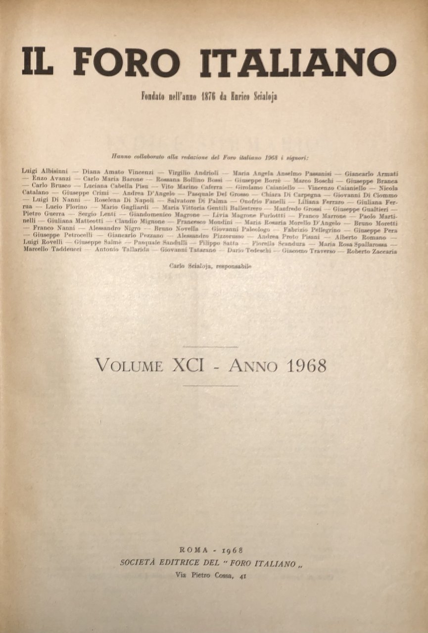 Il Foro Italiano. Fondato nell'anno 1876 da Enrico Scialoja. Anno XCI. 1968