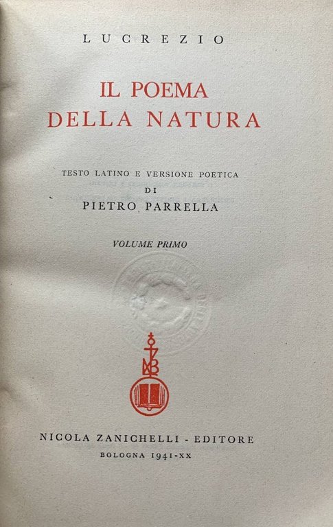 Il poema della natura. Volume primo | Libri antichi e moderni | Lucrezio, ,Lucrezio