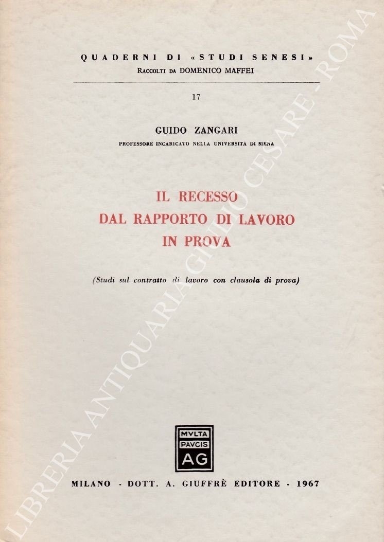 Il recesso dal rapporto di lavoro in prova. (Studi sul contratto di lavoro con clausola di prova) | Libri antichi e moderni | Zangari Guido