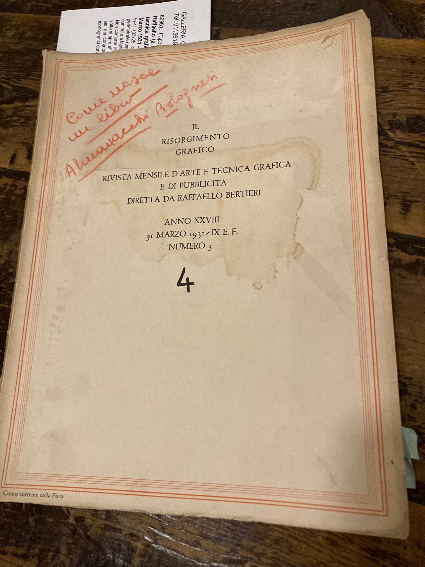 In-4° (33x25 cm), pp. 111-158, brossura editoriale avorio con titoli in nero entro cornice perimetrale rossa. Tavole f/t di specimen e prove di stampa di copertine. Alone al piatto anteriore con note a lapis rosso Più che buon esemplare. Non comune numero della rivista vero e proprio 'laboratorio grafico' di Bertieri che epr la prima volta si apre all discorso tecnico sulla pubblicità. Di grande eleganza la composizione e la stampa sia dei contributi testuali - tra cui spicca quello sugli almanacchi bolognesi - che di quelli iconografici con gli interessanti specimen di bozzetti pubblicitari e frontespizi di volumi antichi