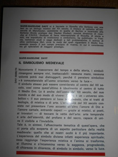 M.-M. DAVY. Roma, Edizioni Mediterranee, 1988. Il Simbolismo Medievale. In-8°, br. 306 pp. con illustrazioni in bianco e nero nel testo. Come nuovo. Uff. stanzetta mob. a sinistra centro sotto.