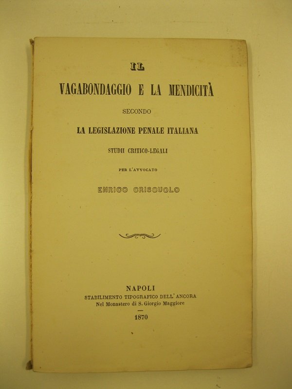 Il vagabondaggio e la mendicita' secondo la legislazione penale italiana. Studii critico-legali | Libri antichi e moderni | Criscuolo Enrico