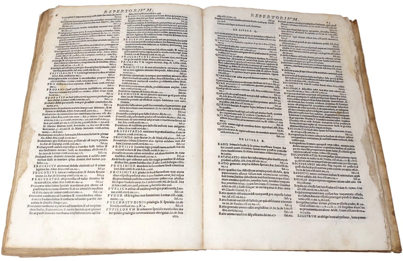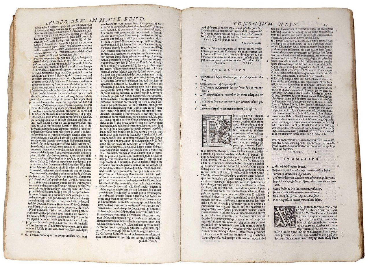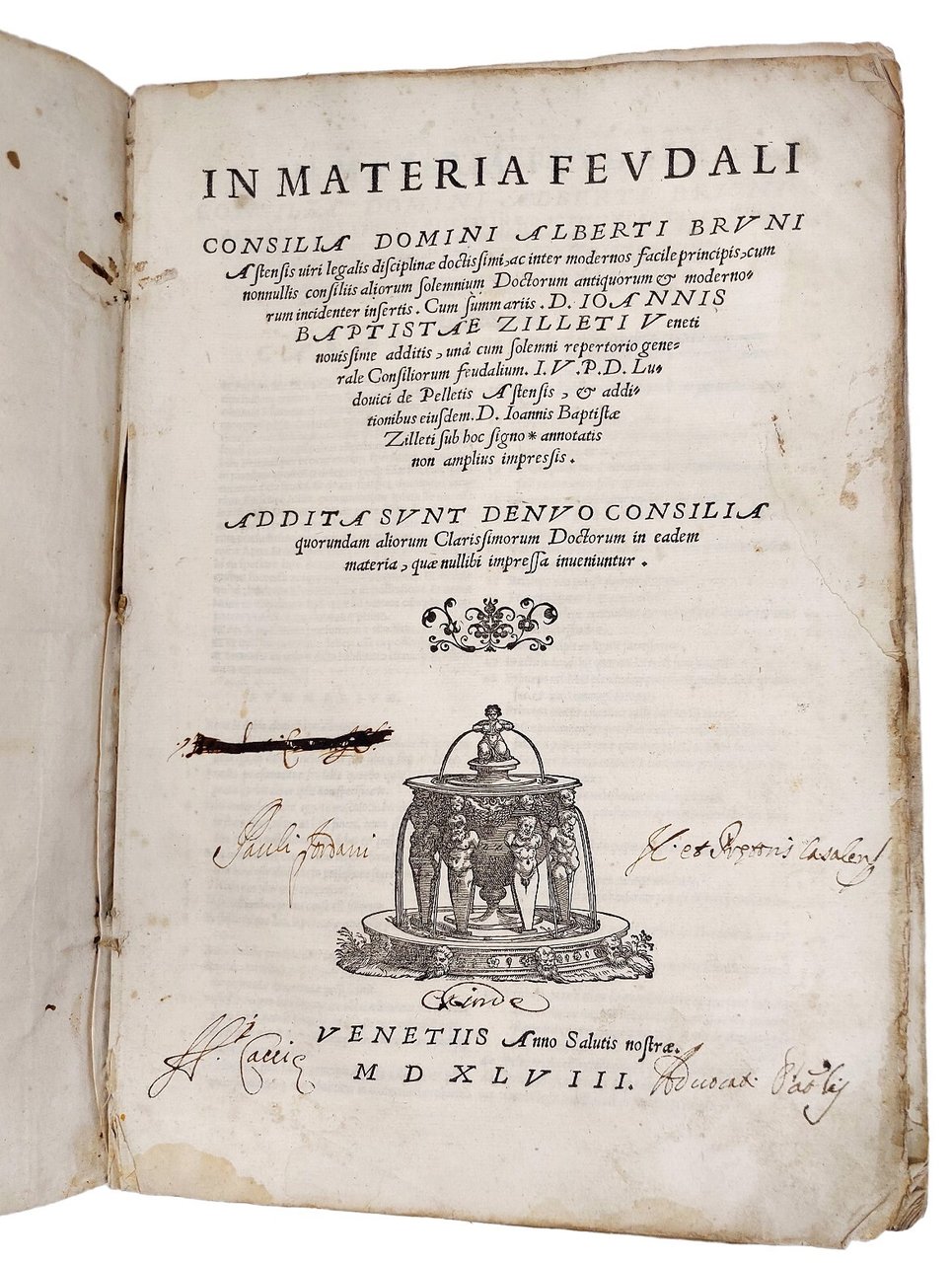 >2 parti in un volume in-folio (300x210 mm), ff. 133, (1 bianco); 52; impresa tipografica su entrambi i frontespizi, numerose iniziali in xilografia, testo su due colonne in car. tondo e corsivo. Legatura coeva in pergamena floscia, titolo ms. al piatto anteriore e al dorso (mancanze ai piatti e al dorso, con parti di cuciture e nervi a vista, ). Prima edizione postuma dell'opera più significativa del Bruni: ''i centoventuno consilia ivi raccolti costituiscono una silloge completa di tutti i settori del diritto feudale: dalle controversie su alienazioni, concessioni, donazioni, divisioni di feudi e di beni feudali alla definizione del rapporto personale e reale tra il principe e il feudatario, dalle potestà degli abitanti del feudo ai diritti dei feudatari, dai pareri in materia penale a quelli sul regolamento delle successioni'' (DBIt., XIV, p. 648). La seconda parte è costituita dal Repertorio generale alfabetico dei Consigli feudali redatto da Giov. Batt. Zilletti. Il giurista piemontese Alberto Bruni, detto comunemente ''d'Asti'', ma nato ad Acqui nel 1467, studiò a Pavia, fu nominato vicario del prefetto di Saluzzo e nel 1520 avvocato fiscale del duca di Savoia; morì ad Asti nel 1541. Compose varie opere giuridiche che all'epoca ebbero notevole successo. Edizione assai rara e buon esemplare, con tracce d'uso e qualche antica postilla ms. nei margini (alcune firme di possesso sul primo frontesp., lievi abrasioni al margine esterno di qualche foglio, strappetto restaurato al margine del frontespizio) Manca al BMC e all'Adams. Fontana, Bibl. legalis I, 151 (ediz. 1582).