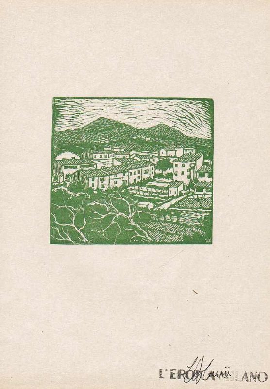 Foglio di cm 31 x 21,5 circa; l'immagine è stampata in inchiostro verde (cm 11,5 x 12,5). Prova di stampa della xilografia che andrà alla p. 29 del Quaderno 87-90 de L'Eroica, dedicato interamente a Giovanni Pascoli; al verso una poesia di Ada Bombini; nell'angolo in basso a destra timbro 'L'Eroica Milano' e firma del direttore della rivista, Ettore Cozzani. Ottimo stato di conservazione. Giovanni ZANNACCHINI (Livorno, 1884 - 1939) è stato pittore, incisore e acquafortista. Autodidatta, coetaneo e amico di Modigliani, si dedicò dapprima all'incisione dando vita a numerose acqueforti e xilografie che gli valsero la fama nazionale e con le quali partecipò alle più importanti manifestazioni italiane ed estere di questo specifico settore; nel 1916 viene invitato all'Esposizione d'Incisione Italiana, organizzata nella sede della Royal Society of British Artists a Londra, dove espone delle acqueforti. In un secondo tempo passò alla pittura ad olio; anche in questo campo si affermò rapidamente e non vi fu manifestazione artistica, a lui contemporanea, dove non fosse presente un'opera di Giovanni Zannacchini. Fu, con Renato Natali e Gino Romiti, fondatore del Gruppo Labronico, Segretario provinciale Professionisti ed Artisti, e membro di numerose giurie nazionali.
