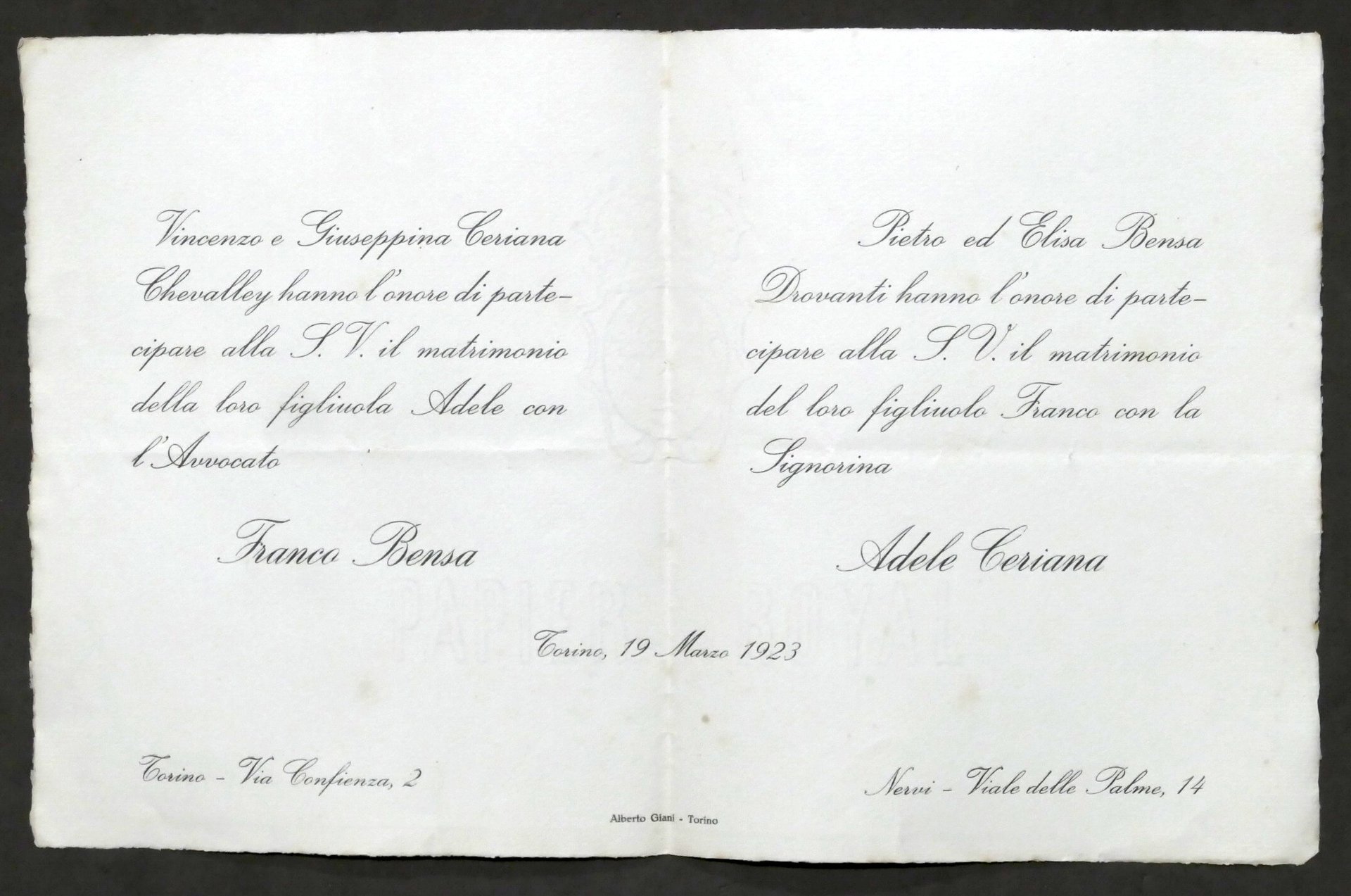 Invito Nozze avvocato Franco Bensa con la signorina Adele Ceriana - Torino 1923