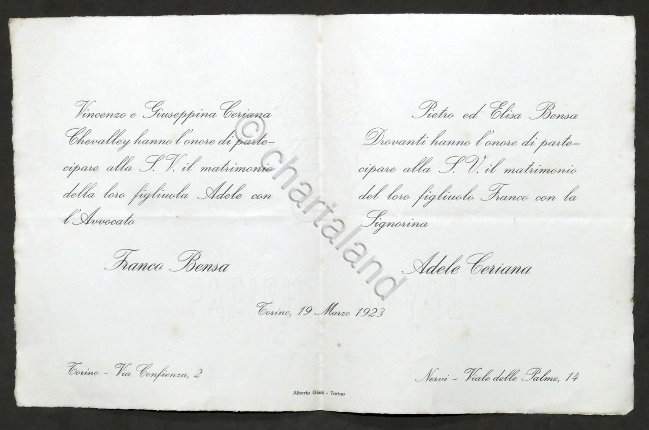 Invito Nozze avvocato Franco Bensa con la signorina Adele Ceriana - Torino 1923 | Libri antichi e moderni |