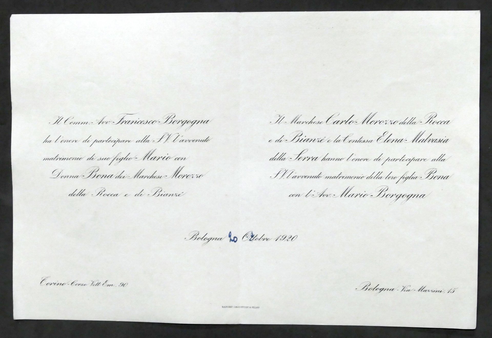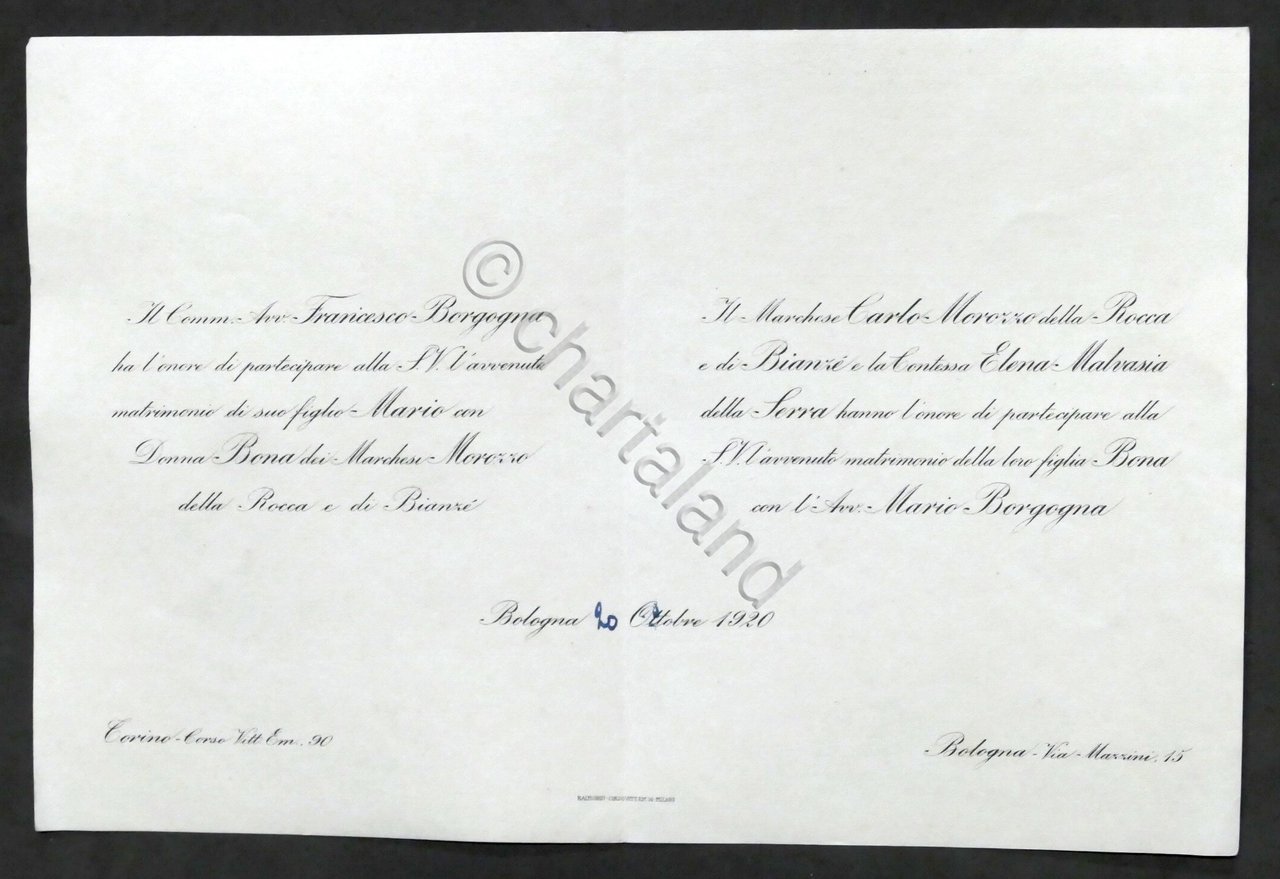Partecipazioni Invito Nozze avvocato Mario Borgogna con Donna Bona dei Marchesi Morozzo della Rocca e di Bianzè - Bologna 1920 Dimensioni aperto: 17 x 25 cm ca.Lingua italiana. Buone condizioni generali.