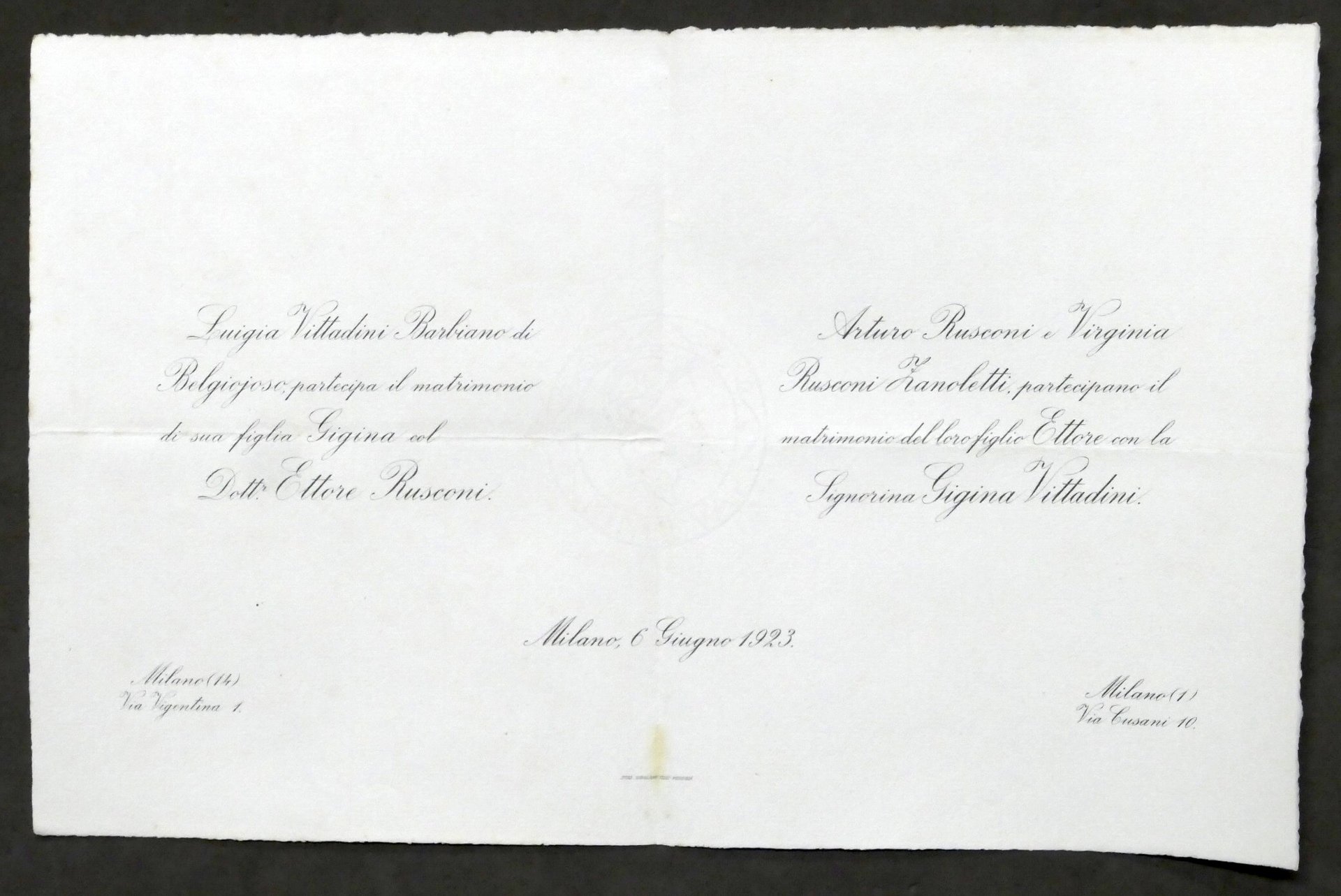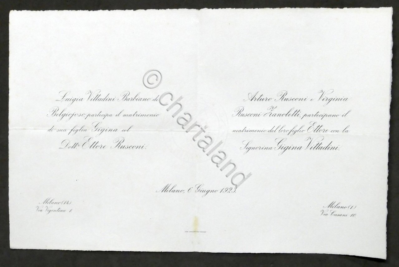 Invito Nozze dottor Ettore Rusconi e la signorina Gigina Vittadini - Milano 1923 | Libri antichi e moderni |